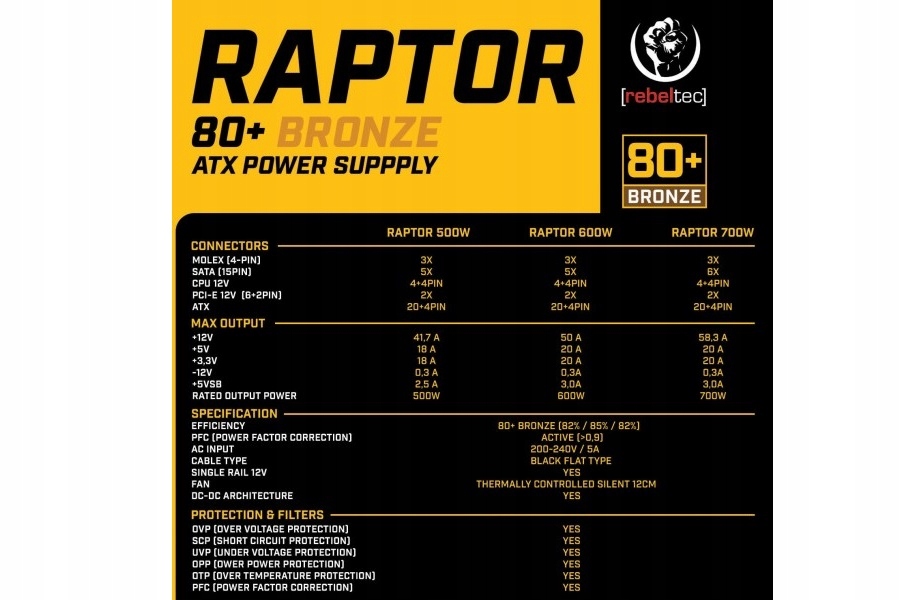 Блок живлення ATX Rebeltec RAPTOR 600W, BRONZE 80+, Single Rail, DC-DC