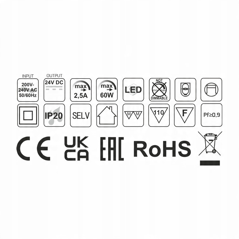 До джерела живлення можна підключити освітлення 24 В постійного струму, наприклад: світлодіодні стрічки, світлодіодні світильники, модулі тощо.