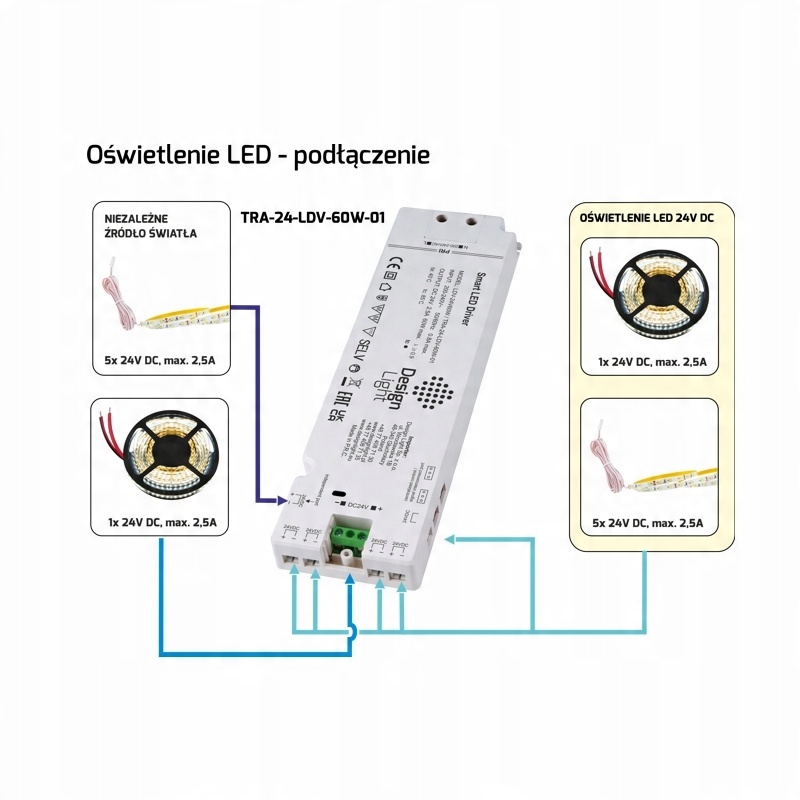 Джерела живлення SMART LED DRIVER можна з’єднувати за допомогою спеціального кабелю PRZ-LDV-SCC-2M-B-01, до макс. 20 штук - доступні на нашому іншому аукціоні.