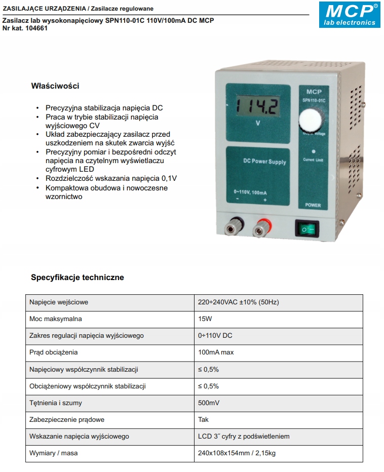 Просматривая «Высоковольтный лабораторный источник питания SPN110-01C DC 110V/100MA MCP», вы можете быть уверены, что данный товар из каталога «Силовые устройства» будет доставлен из Польши и проверен на целостность. В цене товара, указанной на сайте, учтена доставка из Польши. Внимание!!! Товары для Евросоюза, согласно законодательству стран Евросоюза, могут отличаться упаковкой или наполнением.