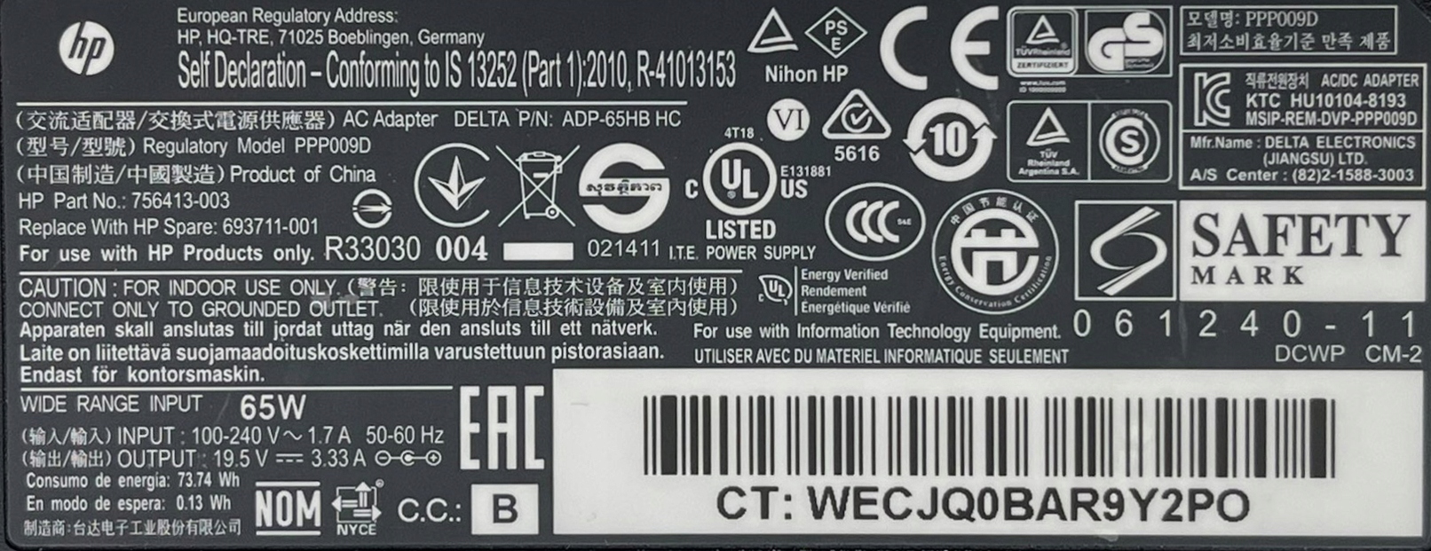 ОРИГІНАЛЬНИЙ АДАПТЕР ЖИВЛЕННЯ HP 65W 19.5V 3.33A 7.4x5.0 PIN