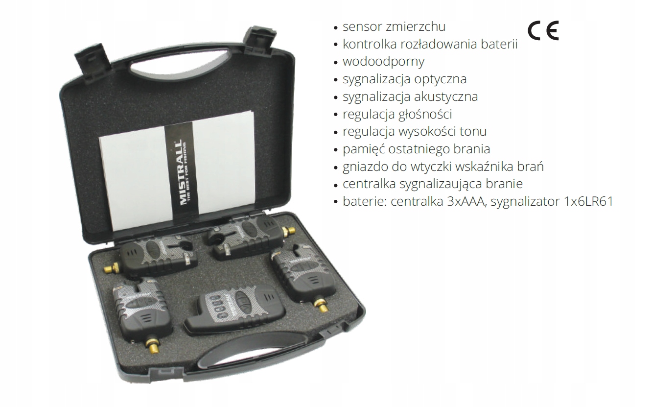 Блок бездротового керування Mistrall містить 4 водонепроникних сигналізатора та комутатор з гучномовцем. Радіус дії пристрою - 100м. Звукова, світлова та вібраційна сигналізація. Сигнали з регуляторами гучності, чутливості та тембру. Сигнали оснащені виходами для свінгерів. Блок керування живиться від маленьких батарейок типу ААА х 3 штуки, тоді як сирени живляться від батарейок 6LR61 (прямокутних 9 В), по одній для кожної сирени. Набір упакований в елегантну валізу, обшиту губкою.