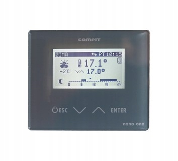 НАНО ОДНОкімнатна панель - це кімнатний термостат, сумісний з регуляторами COMPIT. Ви можете встановити дистанційну комфортну температуру, екотемпературу та температуру в програмі ПОЗА ДОМОМ (ВІДПУСТКА). Перемикання між комфортною температурою, екотемпературою та зоною ПОЗА ДОМОМ здійснюється автоматично за запрограмованим щоденним і тижневим розкладом. Крім того, терморегулятор має розклад на вихідні та ручний режим роботи.