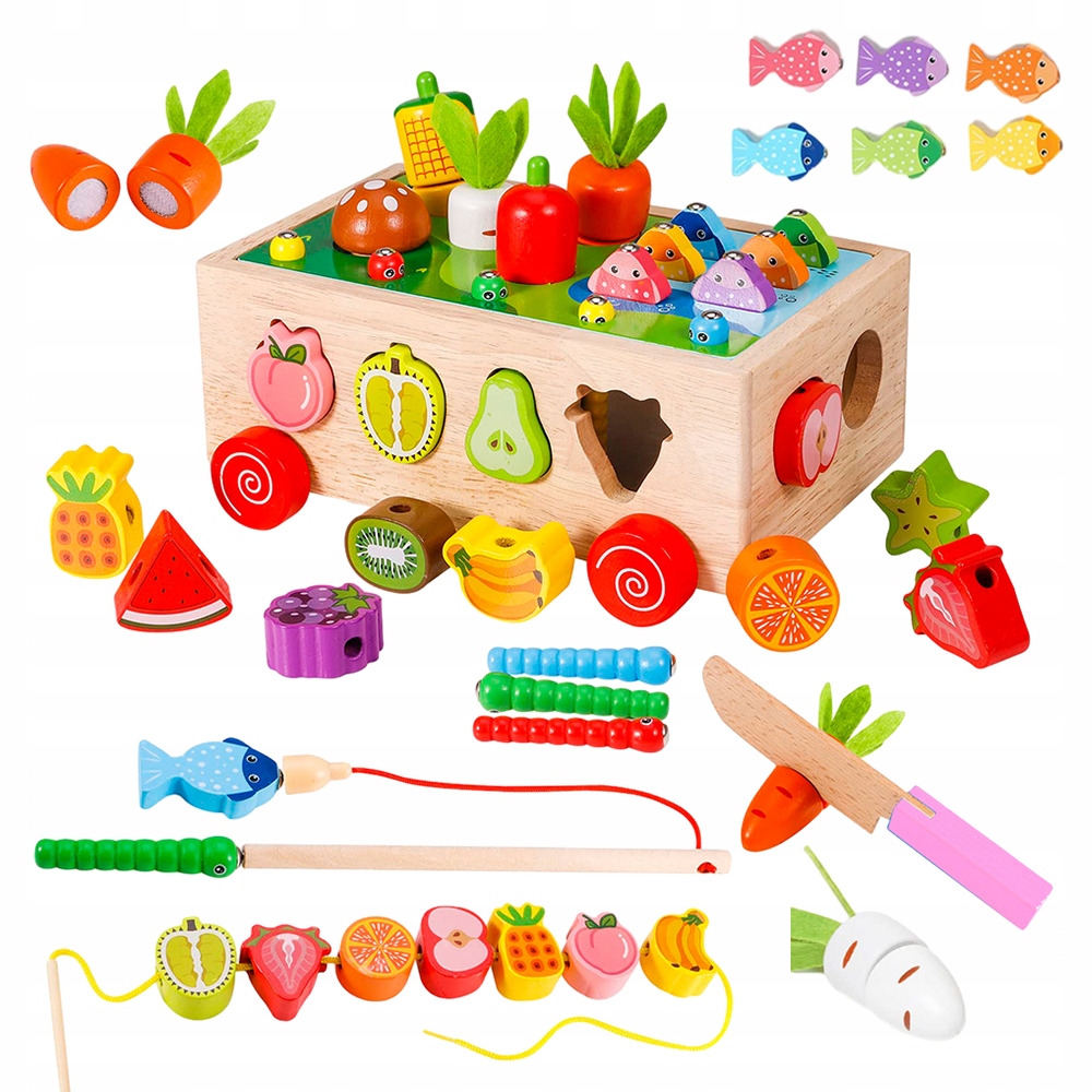 Пазл Монтессорі - сортувальник блоків містить унікальний сортувальник форм, який значно сприяє розвитку когнітивних навичок дітей. Завдяки різноманітним отворам для блоків у формі фруктів і овочів діти можуть вправлятися у з’єднанні форм, що розвиває логічне мислення та зорове сприйняття. Сортувальник форм навчає дітей розпізнавати та називати різні фігури та стимулює координацію рук і очей.
