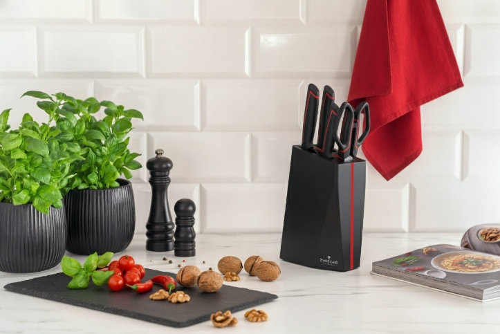 У набір входять: кухарський ніж, нарізка, універсальний ніж, ніж для овочів і багатофункціональні ножиці. Кожен із цих інструментів розроблено з урахуванням ефективності, зручності та сучасної естетики. RED LINE – це більше, ніж блок ножів – це сильний акцент сучасної кухні.