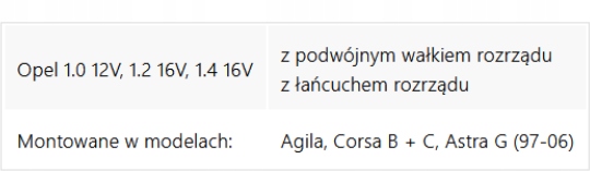 - Opel 1.0 12V, 1.2 16V, 1.4 16V з подвійним розподільним валом і ланцюгом ГРМ