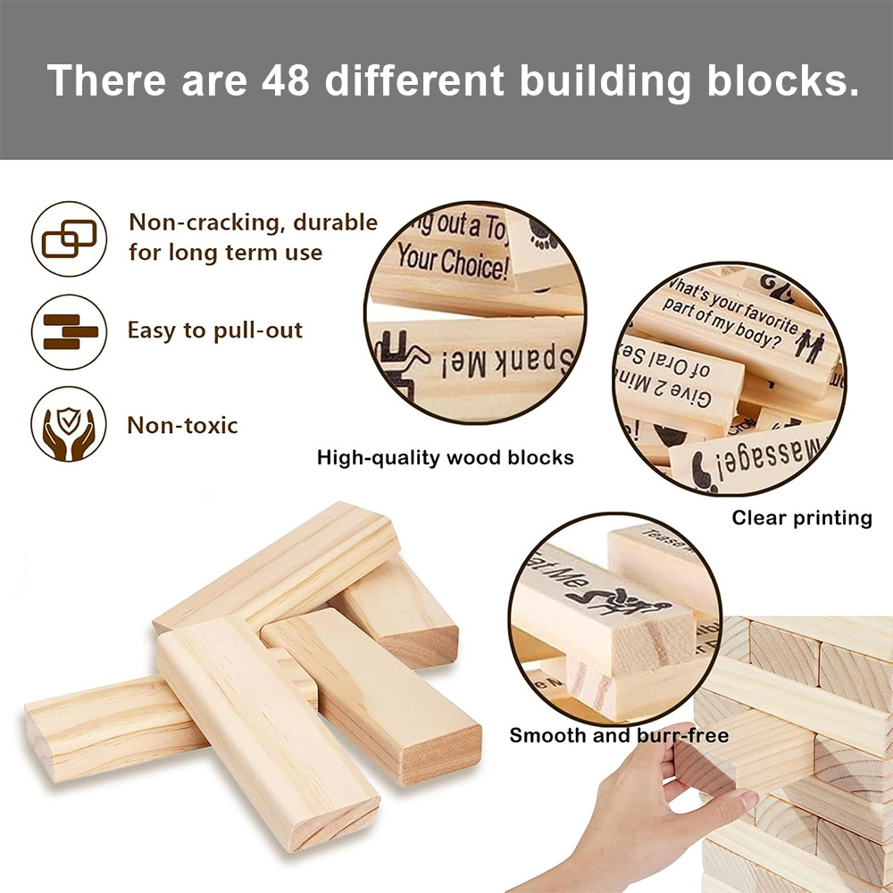 вежа блоків для пар - це унікальна гра, яка принесе нову якість у ваші дати та вечори на два. Дерев’яні блоки були розроблені для забезпечення безпечної та гладкої гри без гострих країв.