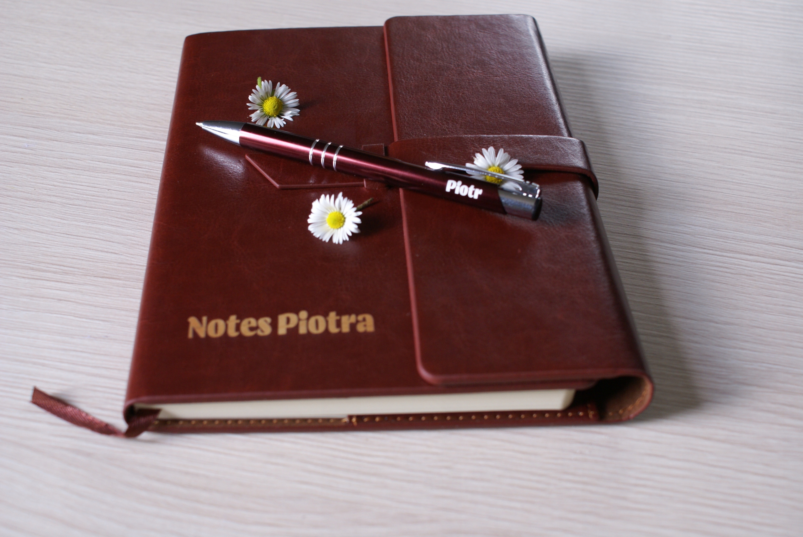 На цьому аукціоні пропонується елегантний блокнот формату А5 з вашим гравіюванням і ручка з вашим гравіюванням. На ручці двостороннє гравірування.