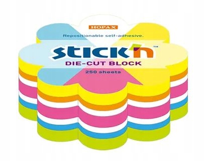 Блокнотний самоклеючий кубик у формі квітки розміром 67×67 мм у міксі неонових кольорів. 50 записки кожна в 4 кольори: жовтий, рожевий, зелений і білий (у двох частинах по 25 штук) і 25 аркушів паперу в 2 кольори : помаранчевий і синій . Загалом блокнот містить 250 аркушів паперу. Клей наноситься на один з країв листівки. Клейкі нотатки ідеально підходять для того, щоб робити короткі нотатки та залишати важливі повідомлення. Кожен блокнот захищений плівкою.