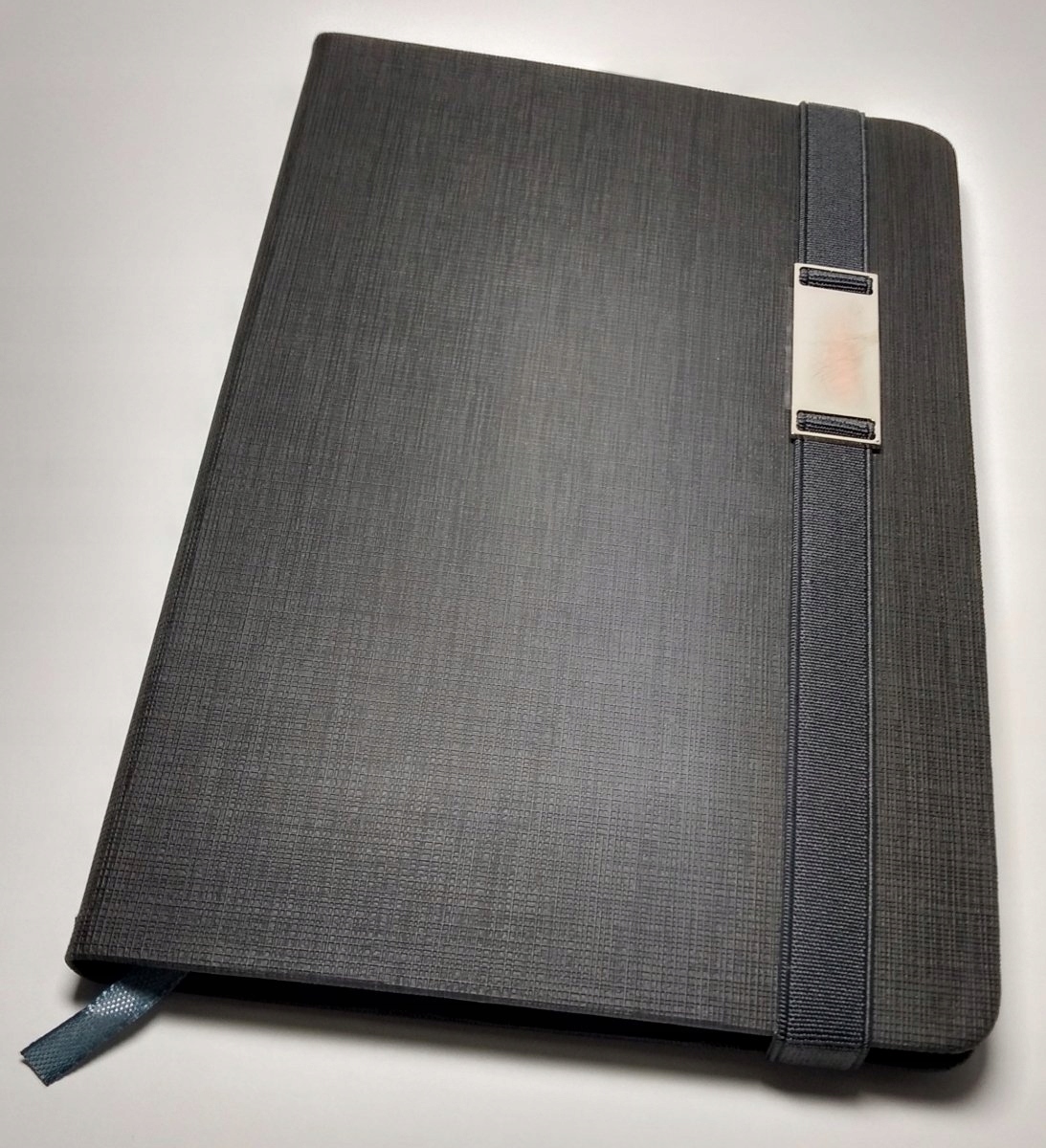 Блокнот формату А5 з ручкою, закривається на гумку, з табличкою - замша з картатим візерунком, обтягнута ЕКО ШКІРОЮ ТИСНЕННЯ, сірий (гумка сіра)