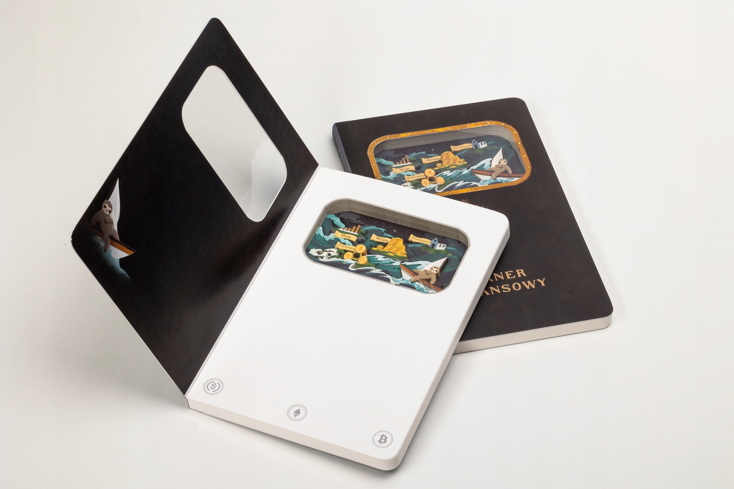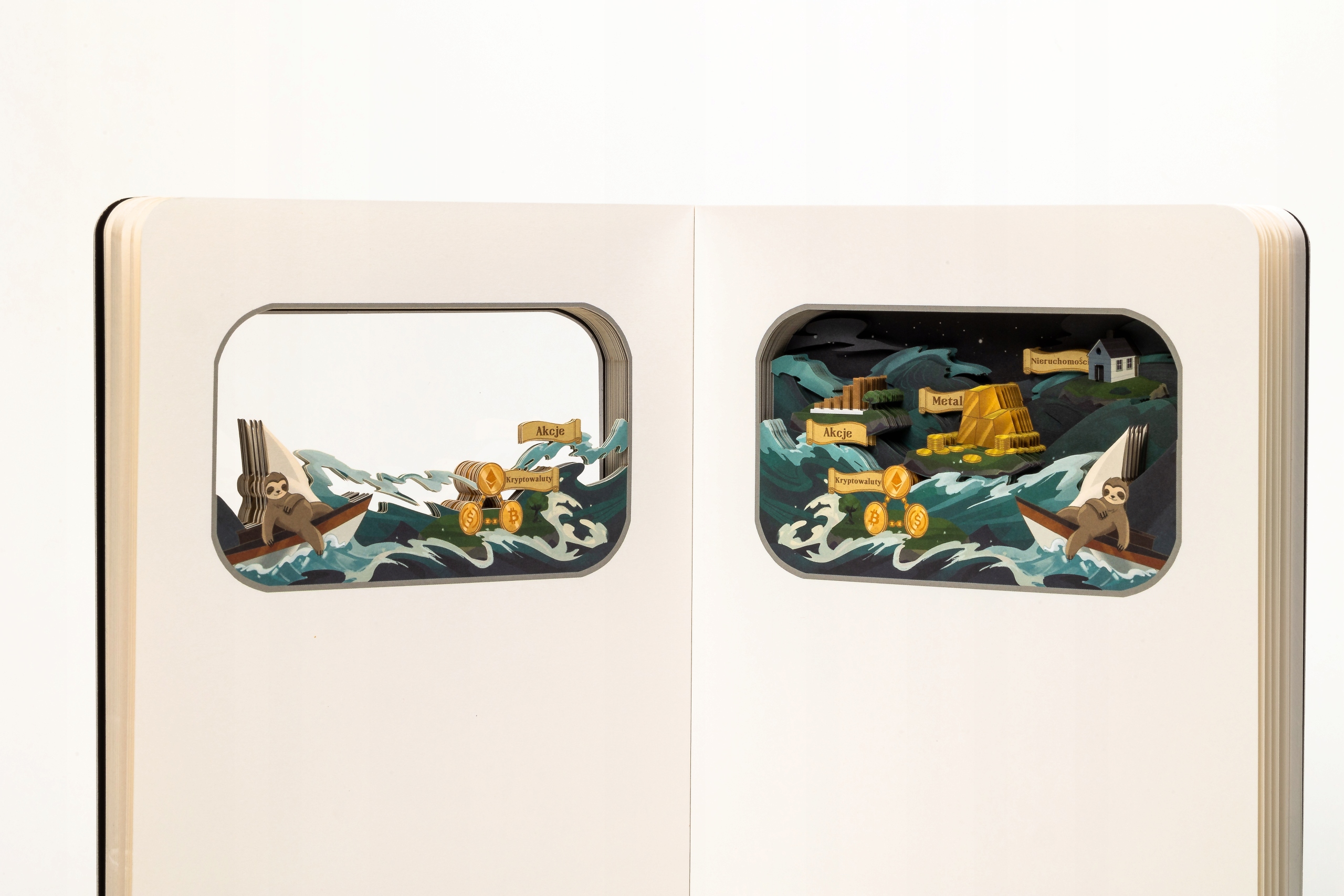 Багатошарова 3D-обкладинка зі справжньою глибиною - не принт, не наклейка. Кожна сторінка має вирізане віконце, крізь яке можна побачити лінивця, який пливе крізь хвилі до Островів інвестицій: акції, метали, криптовалюти та нерухомість.