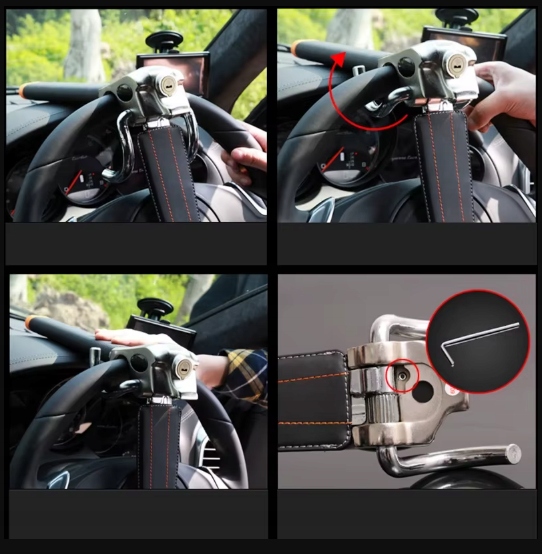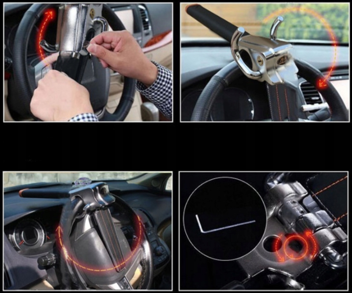 ⚡ Щоб забезпечити максимальний захист, покладіть замок на злегка скручене кермо - так що її плече було між двома сталевими шпильками. Ця позиція запобігає вільно маневруванню керма, ефективно іммобілізуючи транспортний засіб.