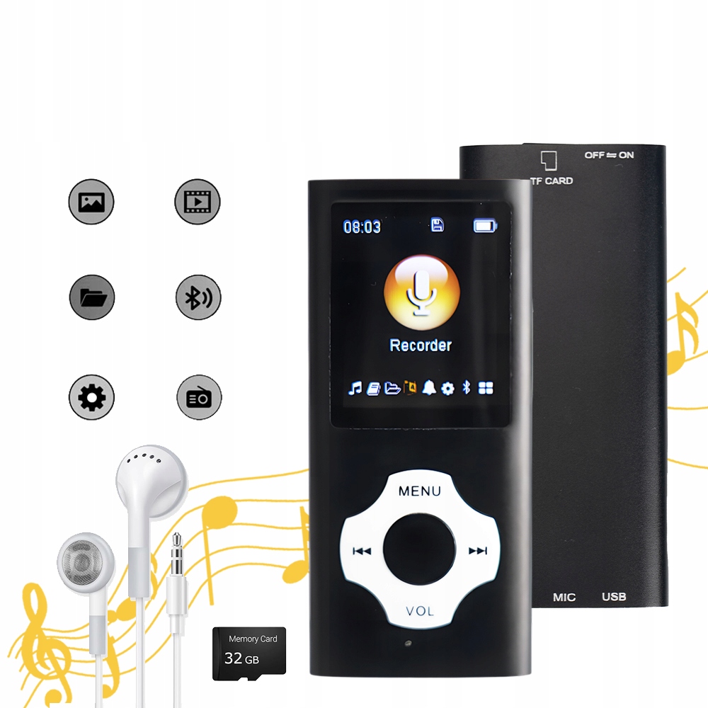 - wbudowany wysokiej jakości układ z funkcją redukcji szumwi i niskimi Zniekszułceniami, Zapewniający Namal Oryginalne efekty Dźwieuke geume. niazdo na kartę można zainstalowac na karcie pamięci o pojemności 32 gb, na której można łatwo Zapisać tysiące utworów, dzięki czemu stanie się ona twoją Бібліотека мобільної музики. Якщо необхідно, ви можете розширити простір на диску за допомогою більшої картки пам'яті ємності до 128 ГБ. (Примітка: функція Bluetooth лише підтримує підключення наборів навушників та динаміків Bluetooth.)