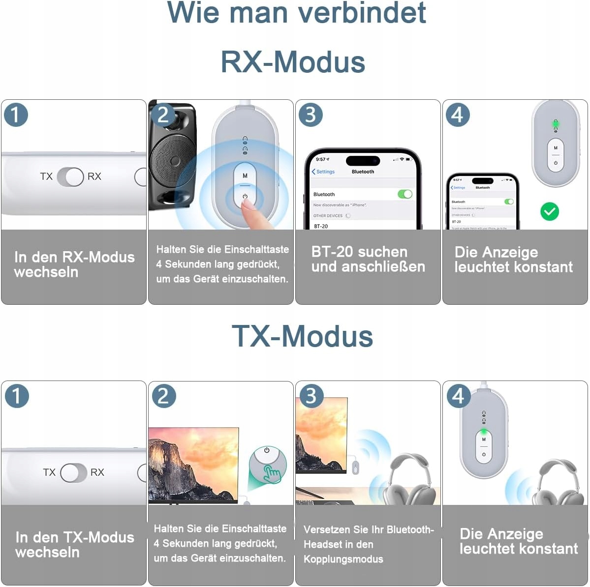 - Адаптер Bluetooth 2 в 1: передавач і приймач Bluetooth 2 в 1, режим TX можна використовувати для настільних комп’ютерів, телевізорів, ігрових консолей, бігових доріжок, літаків та інших пристроїв; Режим RX можна використовувати для старомодних стереосистем, підсилювачів, автомобільних радіоприймачів та інших пристроїв