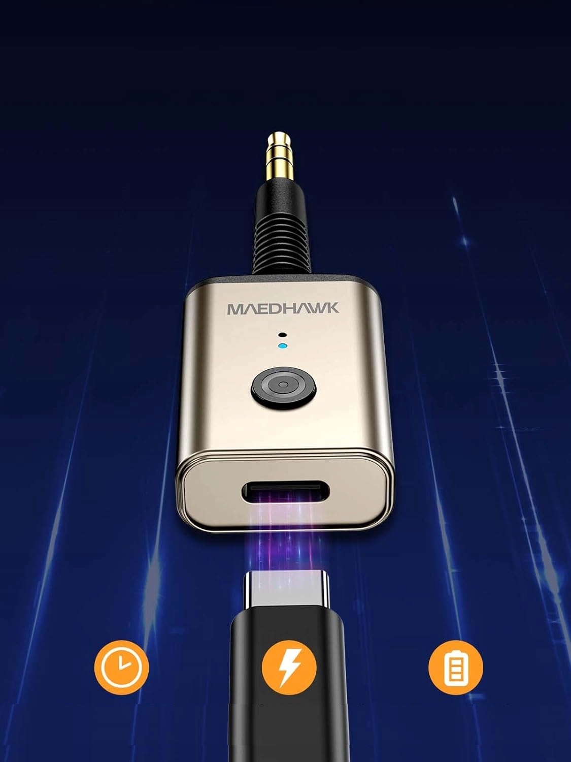 - Гнучка конструкція та подвійне з'єднання: Aux Bluetooth Adapter Maedhawk Auto може скрутити і обертатися в невеликому просторі і скластись у найбільш підходящу позицію для вашої зручності. Крім того, 3,5-мм приймач Bluetooth може поєднувати два пристрої одночасно і не пропускатиме підключення під час прослуховування музики та автоматично підключається до нещодавно парного пристрою