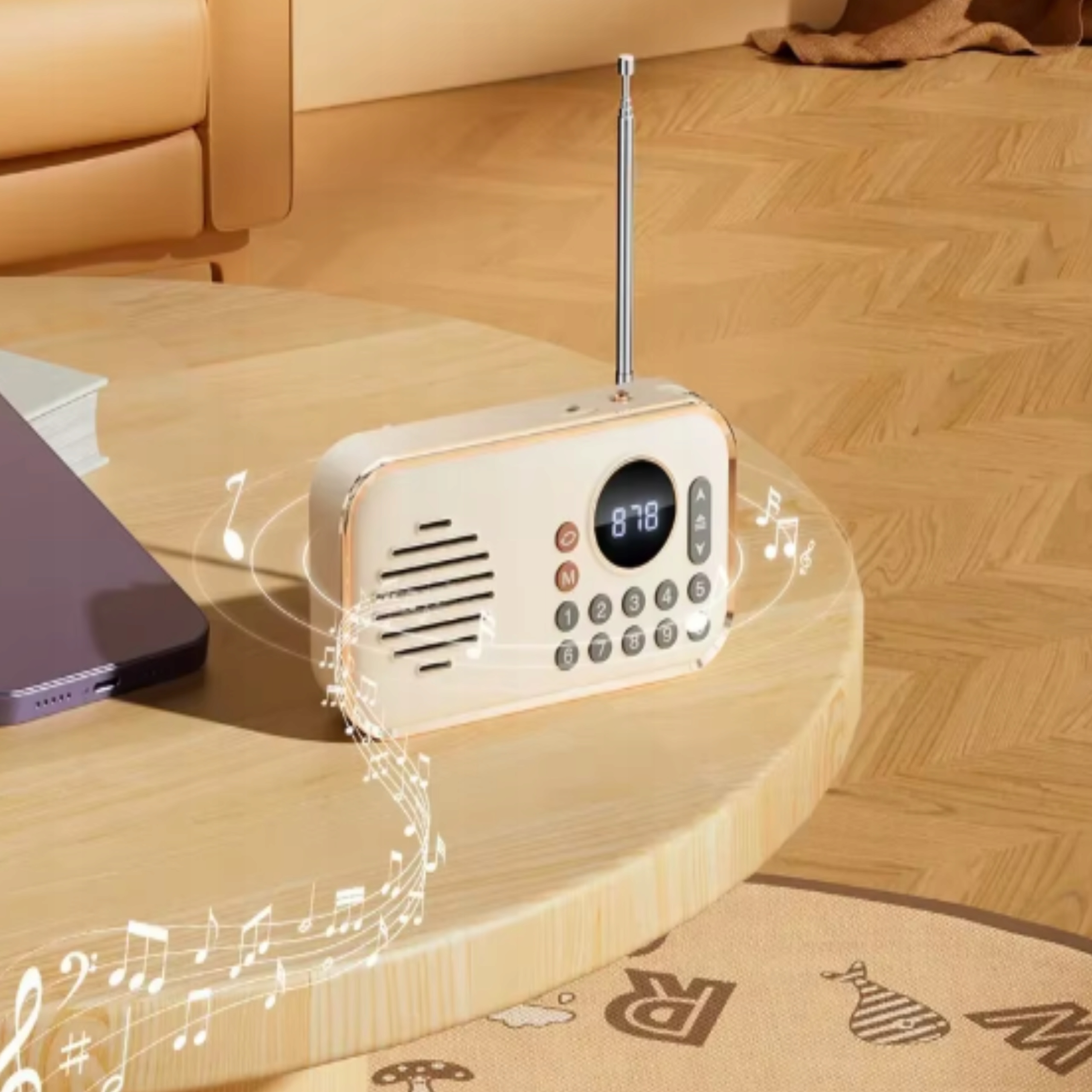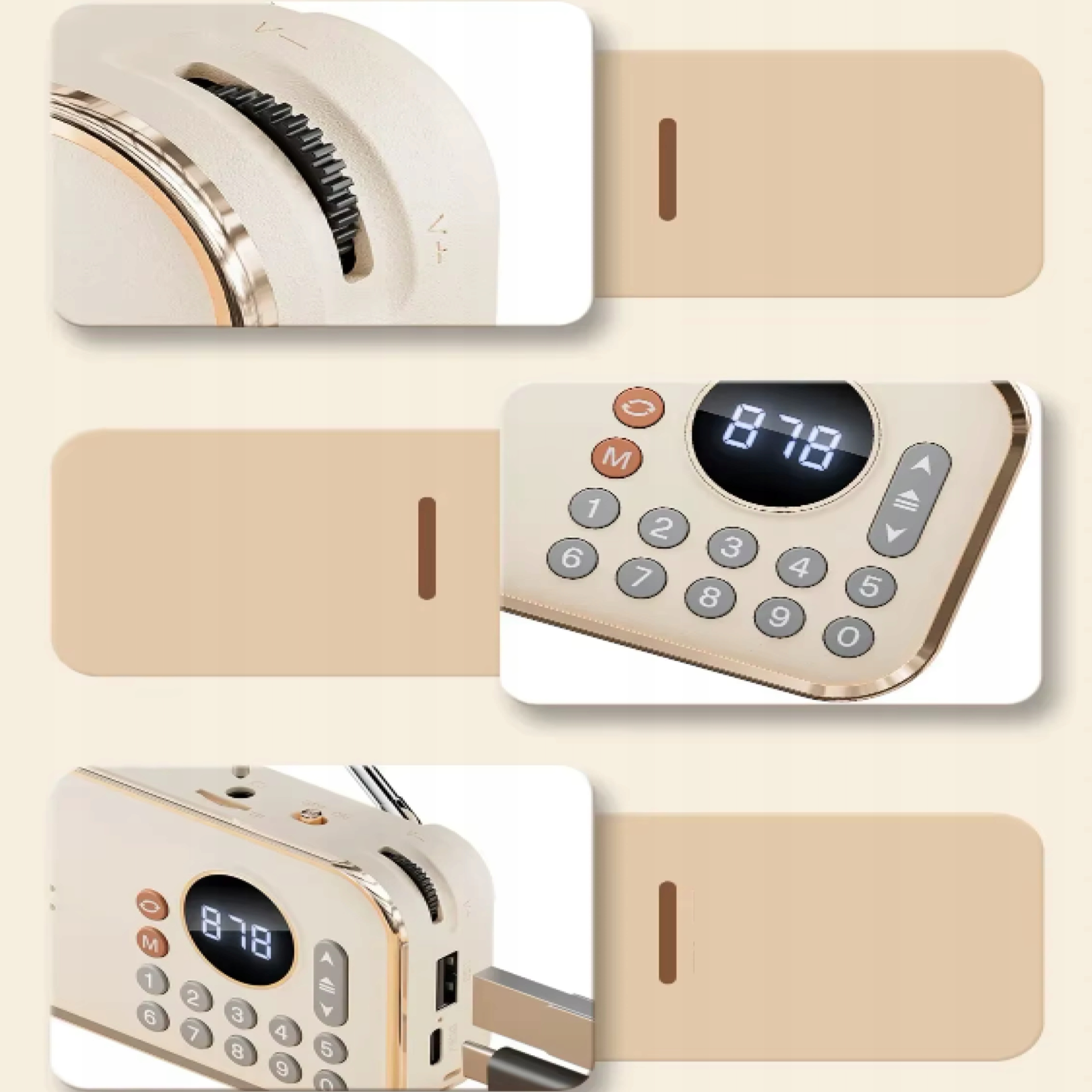 Стильний корпус приваблює зір, золоті краї, регулятор регулювання гучності, числові кнопки, щоб встановити частоту станції, дають їй унікальний шарм. Динамік 5 Вт забезпечує велику гучність, а вбудований акумулятор 1200 мАг дозволяє грати з безперебійною музикою протягом декількох годин. Bluetooth до 20 метрів, , щоб ви могли слухати музику з більшої відстані, не турбуючись, що з'єднання з динаміком буде порушено.