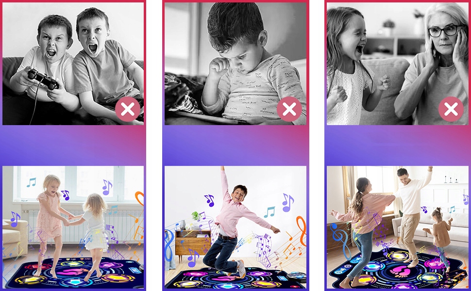 Ви боїтеся, що ваша дитина переросте танцювальний килимок? Не переживай! Цей танцювальний килимок має надзвичайно великий дизайн, розміром 39,4 x 41,1 дюйма (приблизно 100 x 104 см), що значно перевищує середній розмір. Його універсальний дизайн підходить різним віковим групам, включаючи 3-5, 5-8 і 8-12 років. Навіть старші діти та друзі можуть вільно танцювати та випробувати різні ігрові режими.
