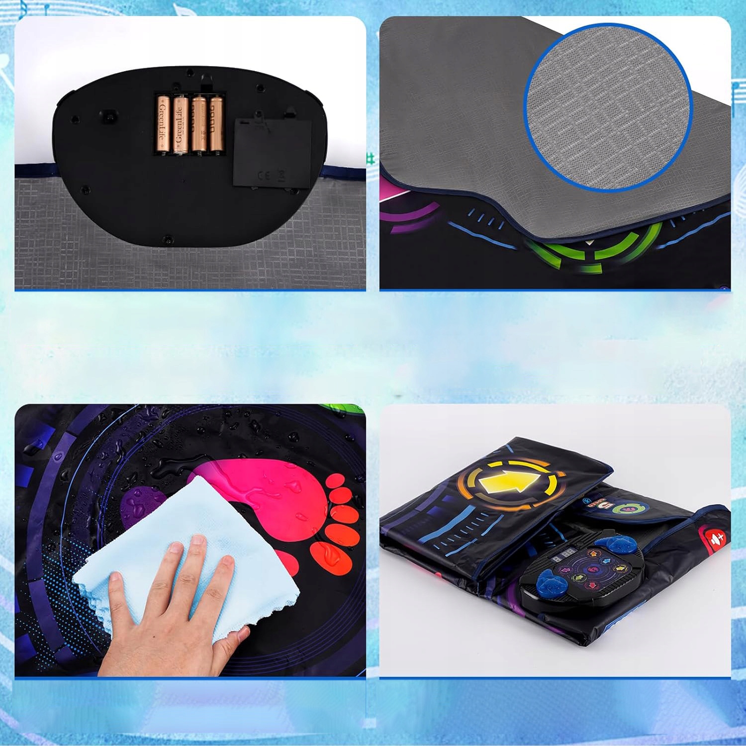 - ✔️Дно має силіконові частинки, які запобігають ковзанню та забезпечують стійкість. Крім того, цей танцювальний килимок є водонепроникним і його можна легко очистити, витерши після використання.