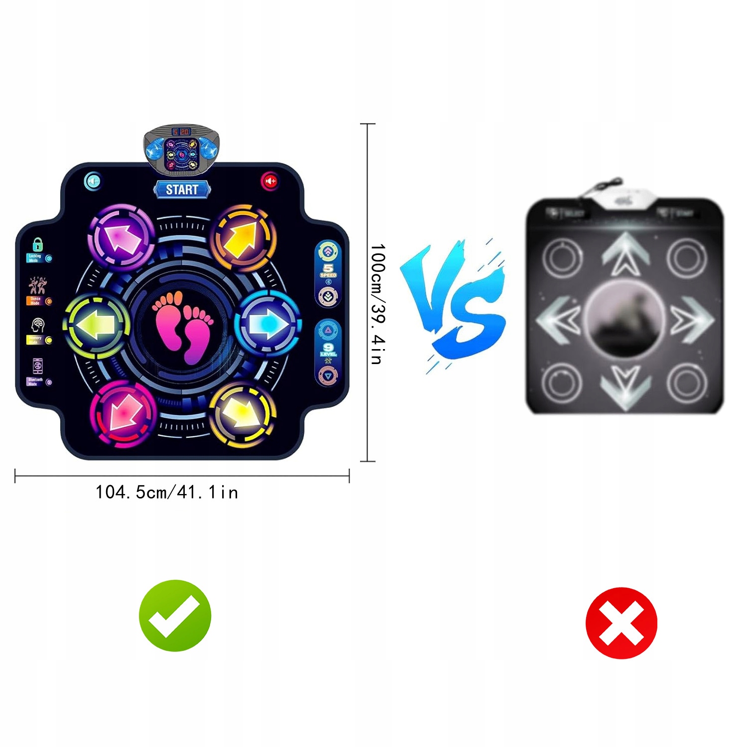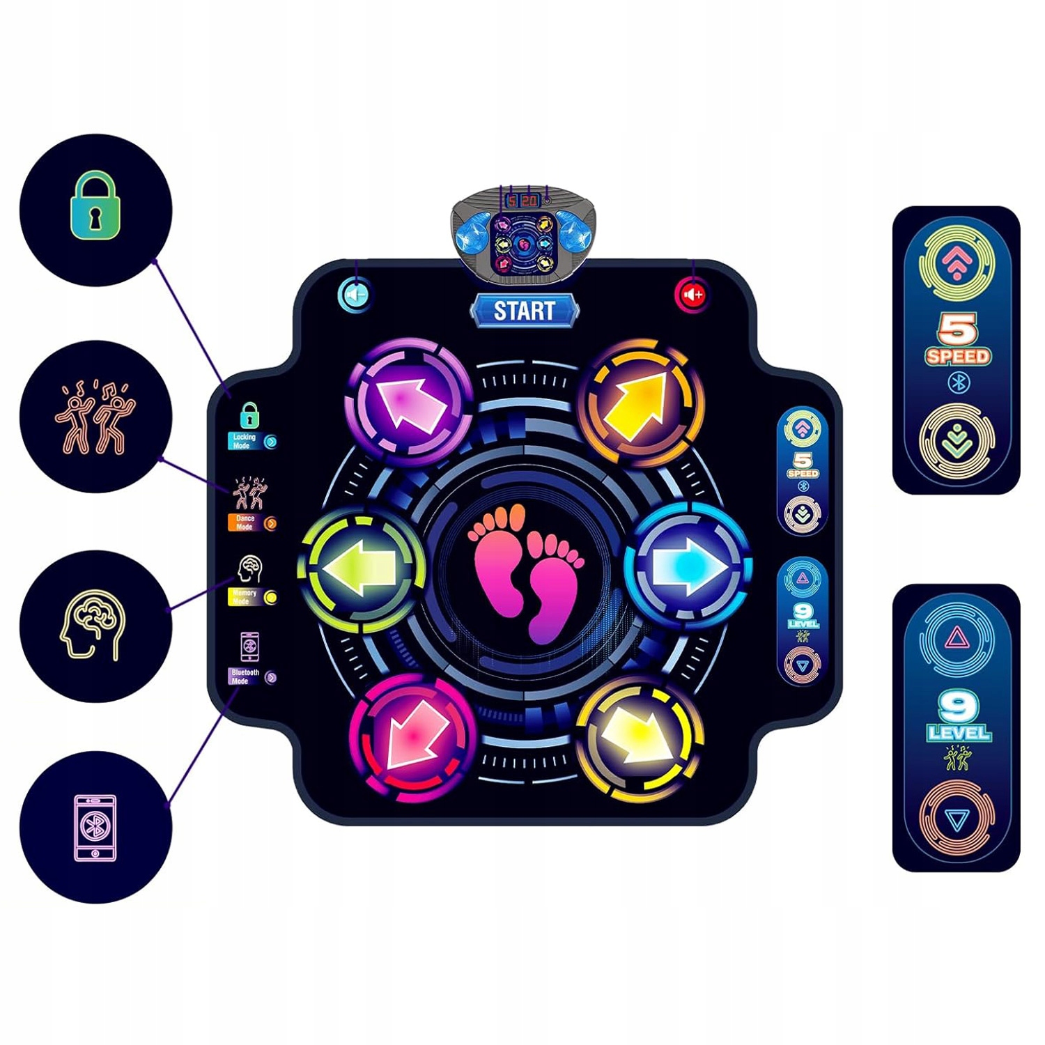 - ✔️ Ви можете вибрати режим вільного танцю, режим пам’яті або режим Bluetooth. Є 9 різних рівнів складності та 5 швидкостей, щоб кинути вам виклик. Ви також можете легко регулювати гучність за допомогою кнопки гучності. Завдяки світлодіодному дисплею ви можете стежити за своїми результатами.