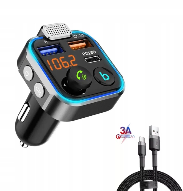 BLUETOOTH FM MP3-ПЕРЕДАВАЧ ЗІ ШВИДКИМ ЗАРЯДЖАННЯМ 3x USB QC 3.0 і RGB + КАБЕЛЬ USB ДО USB ТИПУ C 2 МЕТРИ 3A ШВИДКА ЗАРЯДКА