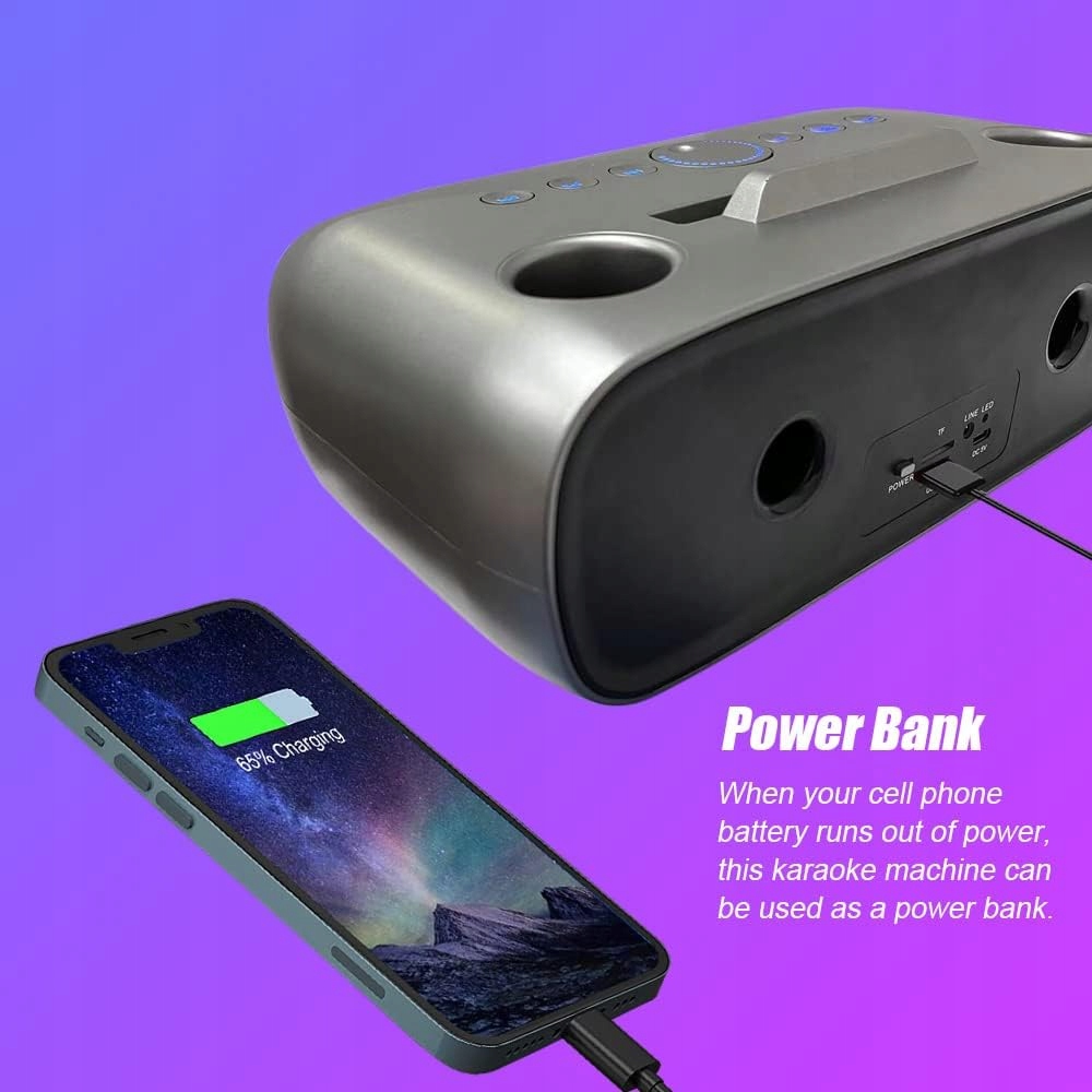 - 【Довгий час автономної роботи】 Вбудована потужна батарея цієї колонки Bluetooth гарантує 4-6 годин безперервної вечірки. Крім того, караоке-колонка також є зарядною станцією для бездротових мікрофонів і акумулятором для вашого мобільного телефону та планшета.