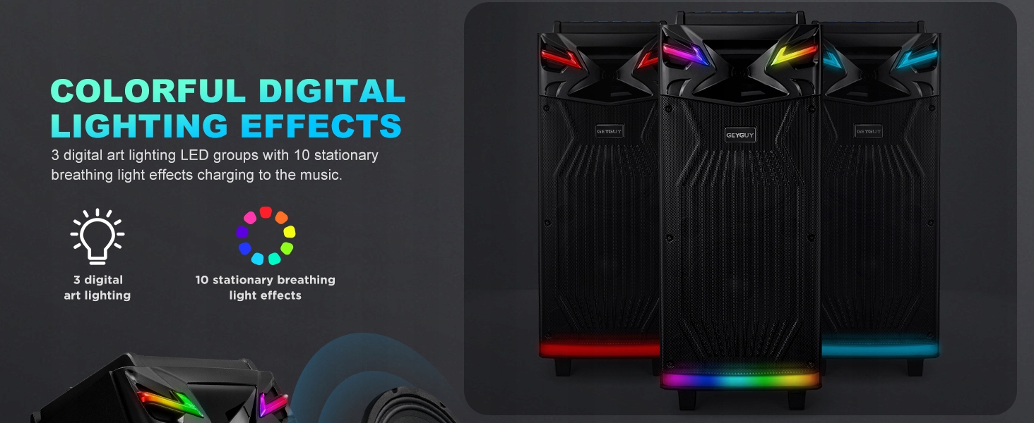 Покращуйте свій музичний досвід за допомогою караоке-машини DSP – поєднання 10-дюймового подвійного сабвуфера з піковою потужністю 800 Вт і високоякісного неодимового залізного твітера забезпечує блискучий, реалістичний людський вокал і глибокий, потужний бас. Ця міцна дерев’яна караоке-система з режимами внутрішнього/зовнішнього/супербасу та покращеною якістю звуку охоплює площу до 9 квадратних метрів.