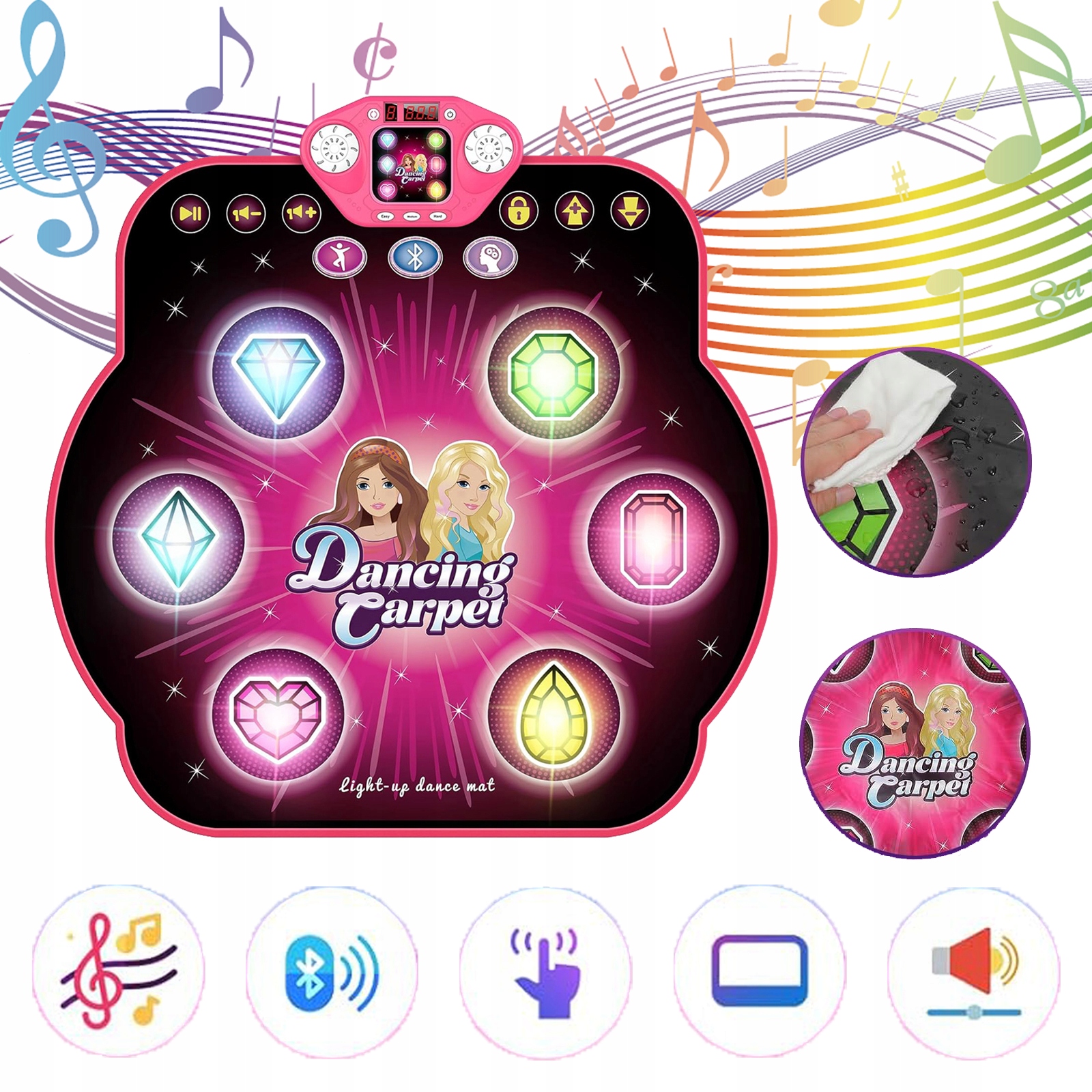 Танцювальний килимок підтримує бездротове з'єднання Bluetooth , що дозволяє легко підключити телефон, планшет або інший пристрій. Тепер ви можете відтворювати свою улюблену музику, не використовуючи кабелі та контролювати гучність безпосередньо з пристрою. Насолоджуйтесь танцем і вдень, і вночі! 🎶📱