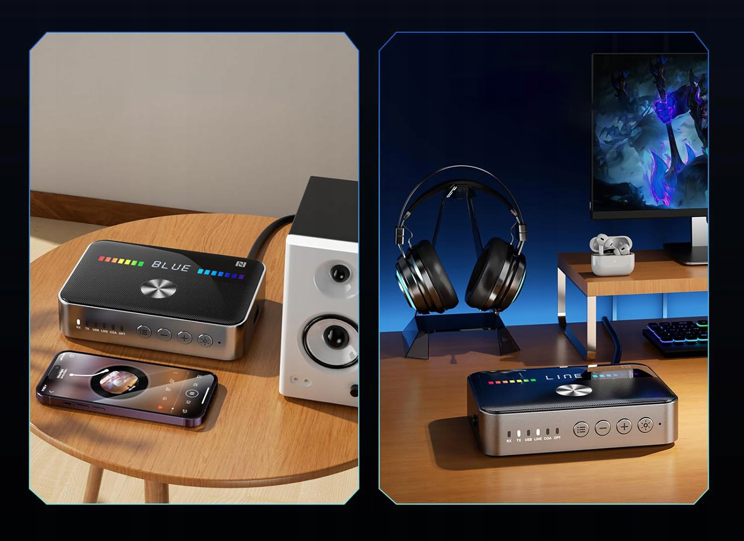 - Конструкція «Два в одному» — Bluetooth-приймач (RX) і Bluetooth-передавач (TX), підходить для активних динаміків, підсилювачів, телевізорів, настільних комп’ютерів, проекторів, Bluetooth-гарнітур тощо.