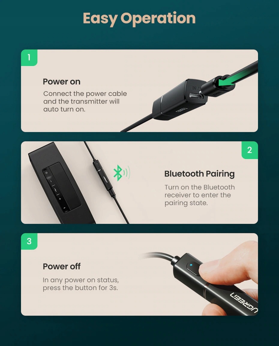 Завдяки передавачу ми можемо бездротовим способом надсилати музику з пристроїв без модуля Bluetooth (наприклад, телевізора, комп’ютера) на пристрої, обладнані цією технологією. , наприклад, навушники або динаміки bluetooth. Пристрій підтримує технологію Bluetooth 5.0. Дальність передачі - 10 метрів. У набір входить 1-метровий кабель micro USB для живлення передавача.