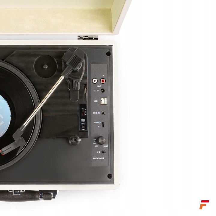 Стильний програвач Fenton RP115C з Bluetooth і USB. Поворотний столик у стилі старої валізи — це стильне доповнення до вашого дому. Невелика вага разом із білою шкіряною обробкою робить Fenton RP115 справді привабливим. Цей непомітний пристрій приховує більше, ніж ви можете собі уявити. Fenton пропонує функції автоматичної зупинки, регульовану швидкість, підключення Bluetooth, порт USB і вхід AUX.