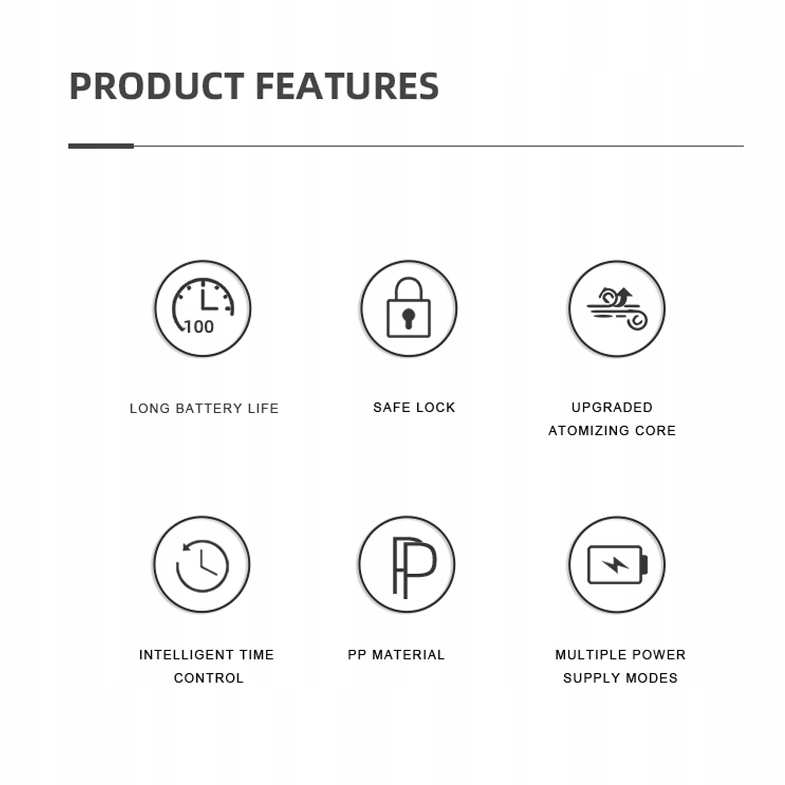2. Функції безпеки: насолоджуйтесь до 100 днів безперервної роботи з покращеною технологією розпилення. Конструкція замка безпеки забезпечує спокій, що робить його ідеальним для дому та вітальні. Функція інтелектуального синхронізації дозволяє легко настроювати навколишнє середовище.