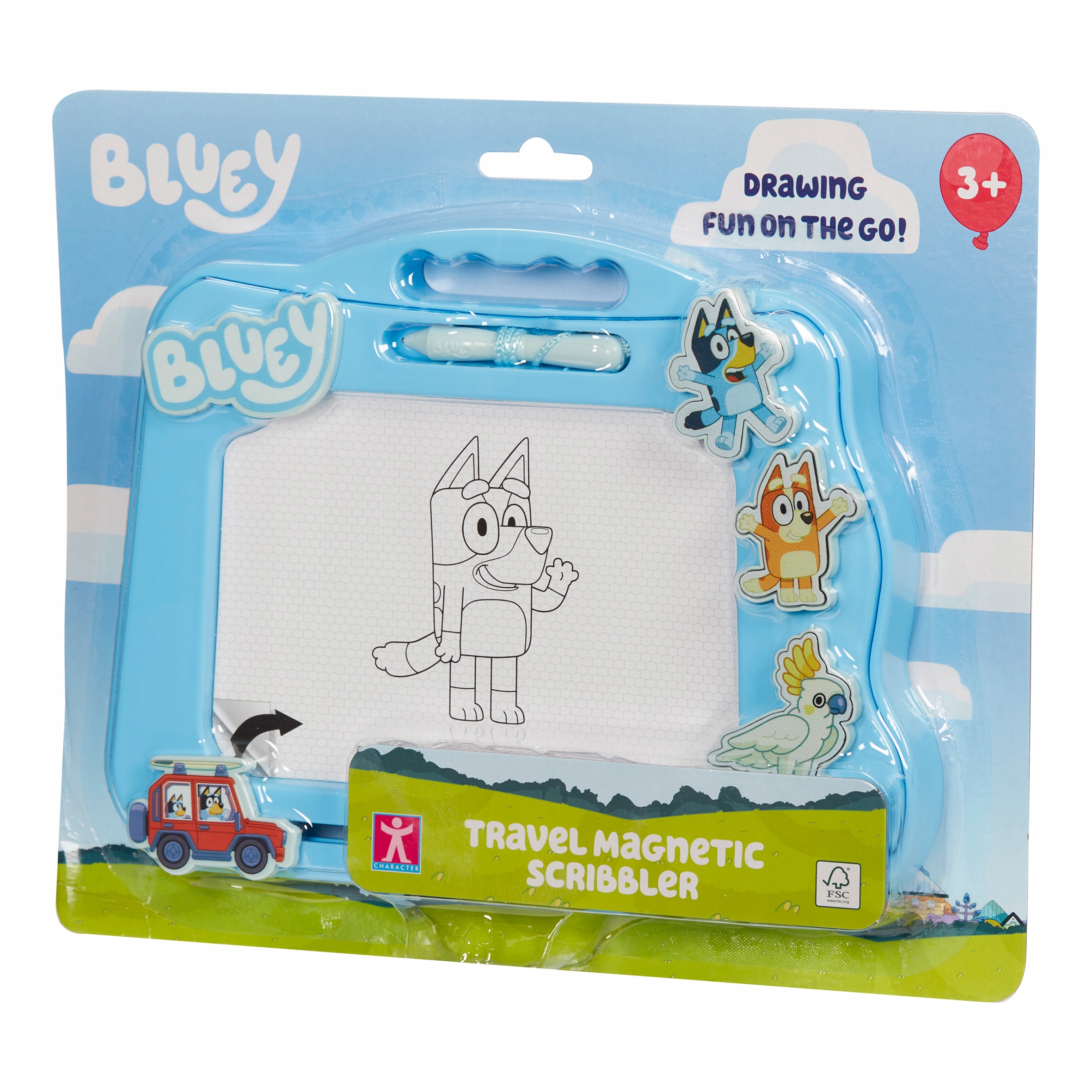 Bluey-6-річна австралійська вівчарка, яка любить грати. Її батьки та вчителі приділяють їй багато часу, щоб займатися фізичними вправами, тому вона стала дуже хорошою в придуманні ігор та допомагаючи іншим вибирати свої ролі та встановлювати правила. Її улюблені ігри - це ті, в яких багато дітей та дорослих беруть участь (зокрема, її тато), і їй подобається найбільше робити вигляд, що вона вже доросла людина і робить речі, відведені для дорослих. Він любить перетворювати кожен день своєї родини на нескінченну і радісну пригоду. Завдяки цій іграшці ви проведете багато радісних годин, малюючи та живопис. Таблетка легка і магнітна. Набір містить магнітну ручку та 3 марки, завдяки якому ви намалюєте своїх улюблених персонажів із Bluey Fays.