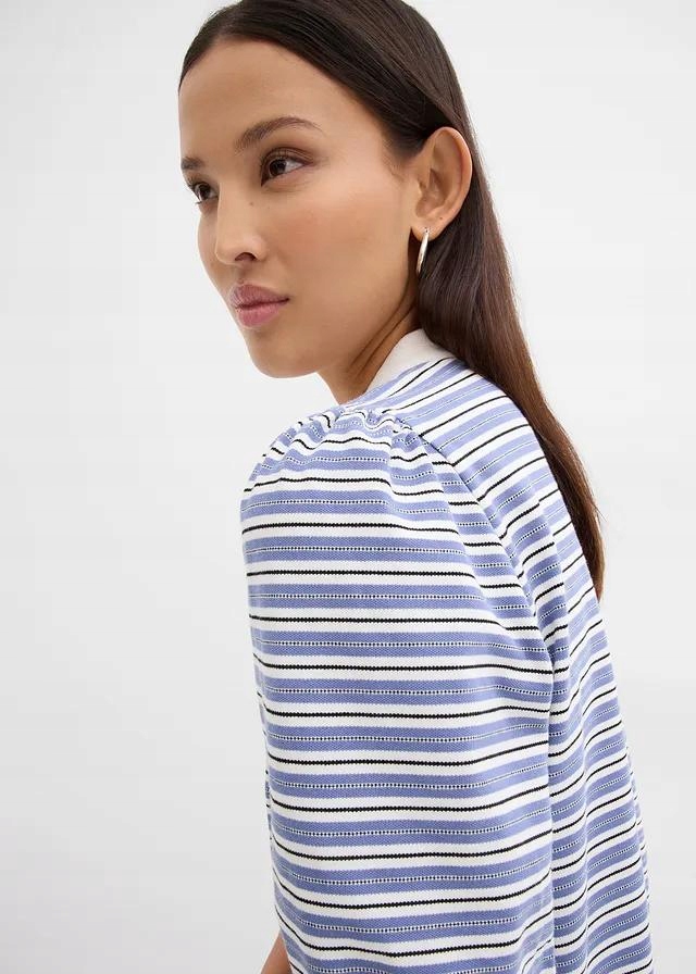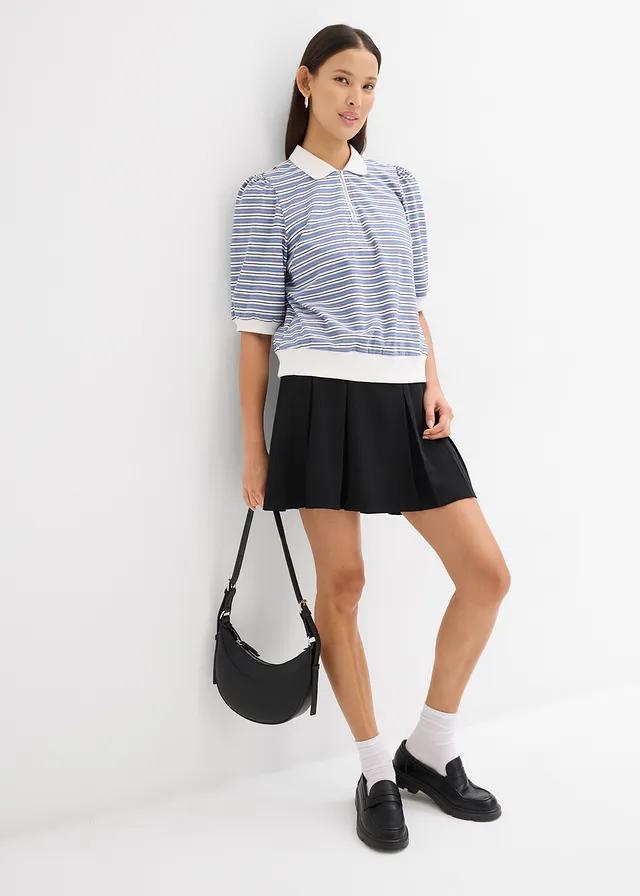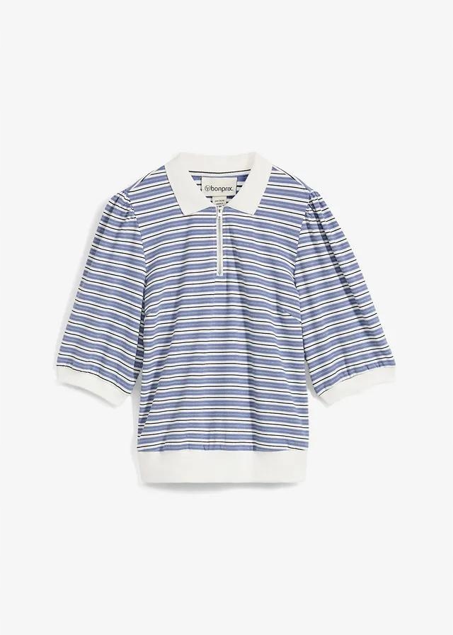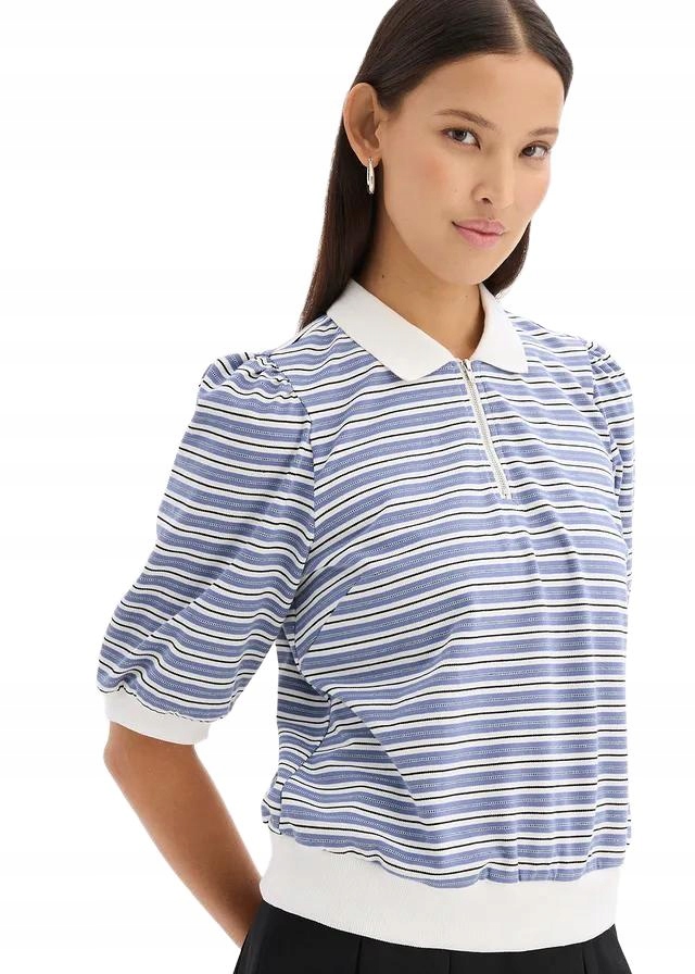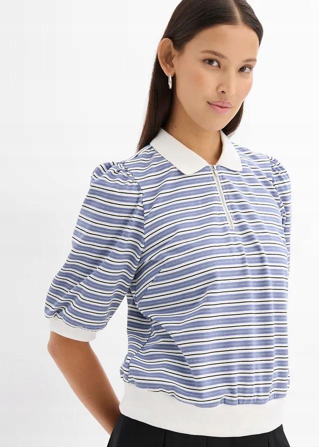 БЛУЗКА-ПОЛО В СМУЖКУ НА ЗАМКИ-БЛИСКАВЦІ ТА РУКАВАХ 3/4 ПУХИ — модний і зручний вибір для щоденного використання. Виготовлений з високоякісного матеріалу, він поєднує в собі спортивний стиль і жіночну елегантність завдяки пишним рукавам довжиною 3/4. Застібка-блискавка замість гудзиків додає сучасний характер і дозволяє регулювати виріз. Смужки надають блузці незмінний візерунок, який можна легко підібрати до багатьох стилів.