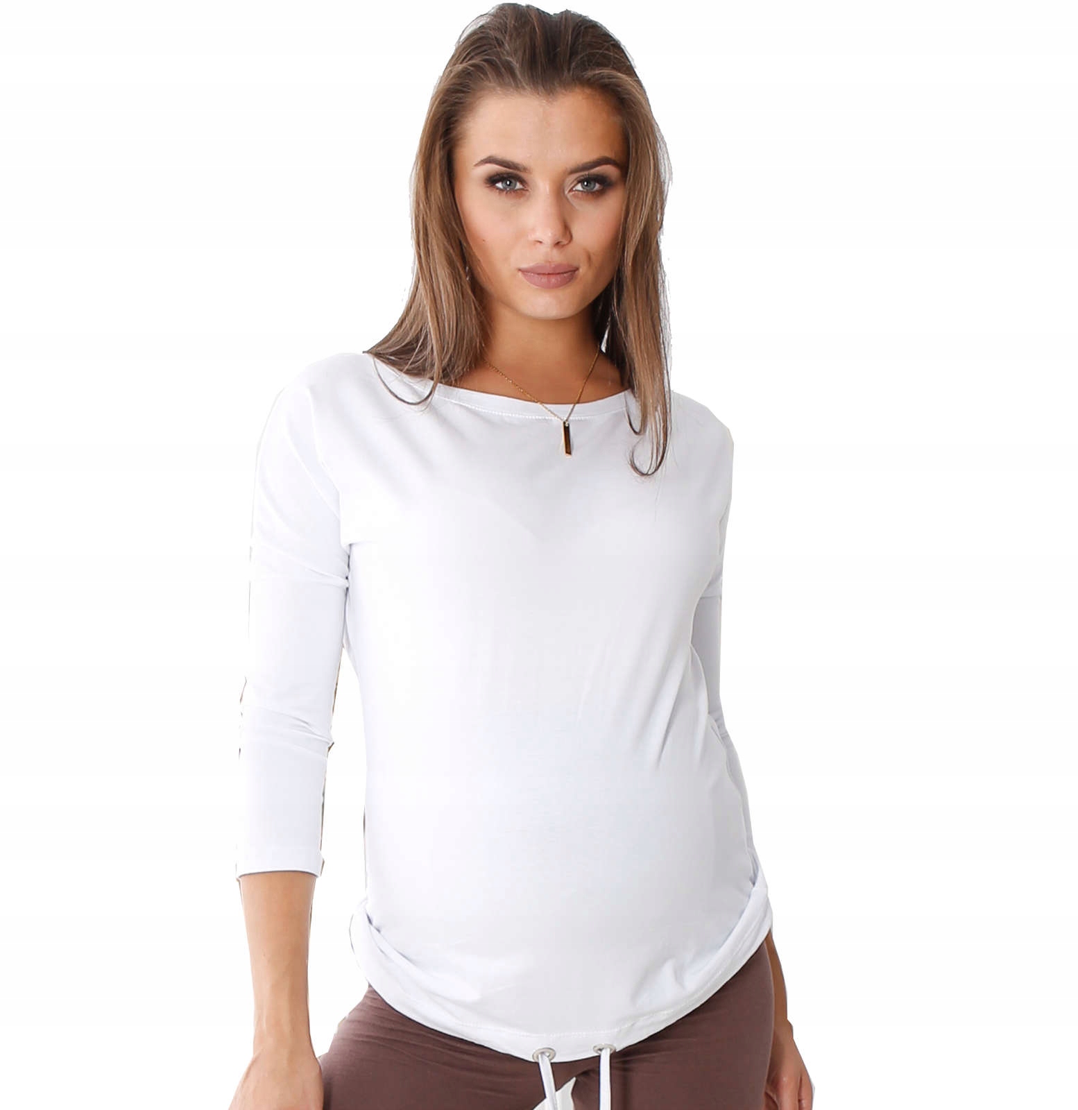 Базові бавовняні блузки - це стиль, який повинен бути в гардеробі абсолютно кожної жінки. Найбажанішими, звичайно, є білі блузи, які є надзвичайно універсальними та абсолютною класикою. Ідеально підходить як блузка для вагітних і після вагітності! Такі моделі дозволяють нам створити правильну основу для стилю, яку потім ми можемо стилізувати відповідно до власного смаку. Білу блузку також можна носити як окремо з модними джинсами та спідницями, так і зі спортивними штанами чи шортами. Він сам по собі дуже модний, тому не потребує багато прикрас, щоб чудово виглядати на фігурі. Ця біла жіноча блуза має виріз у формі човника, який додає багато жіночої грації та чарівності.