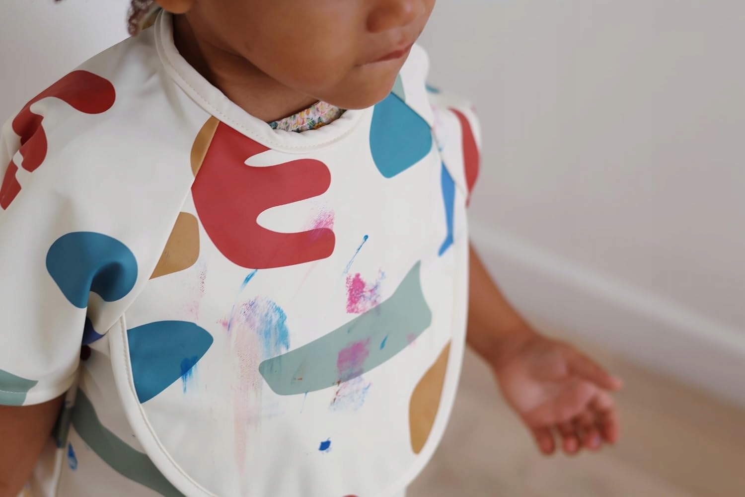 Нагрудник зі знімними рукавами захищає одяг вашої дитини під час їжі та уроків мистецтва. Рукава можна легко відокремити та знову прикріпити. Розкладна кишеня спереду допомагає вловлювати крихти та краплі під час дитячого харчування, коли кишеня вам не потрібна, напр. під час малювання просто залиште його складеним.