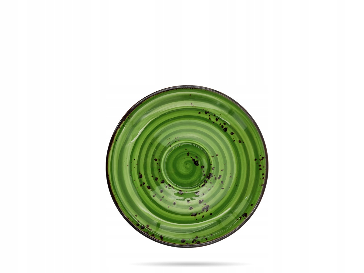 Блюдце має декоративний коричневий обідок. Надзвичайно оригінальний дизайн у вигляді злегка вкраплених темних візерунків на фоні глибокої зелені всередині робить його дуже унікальним.