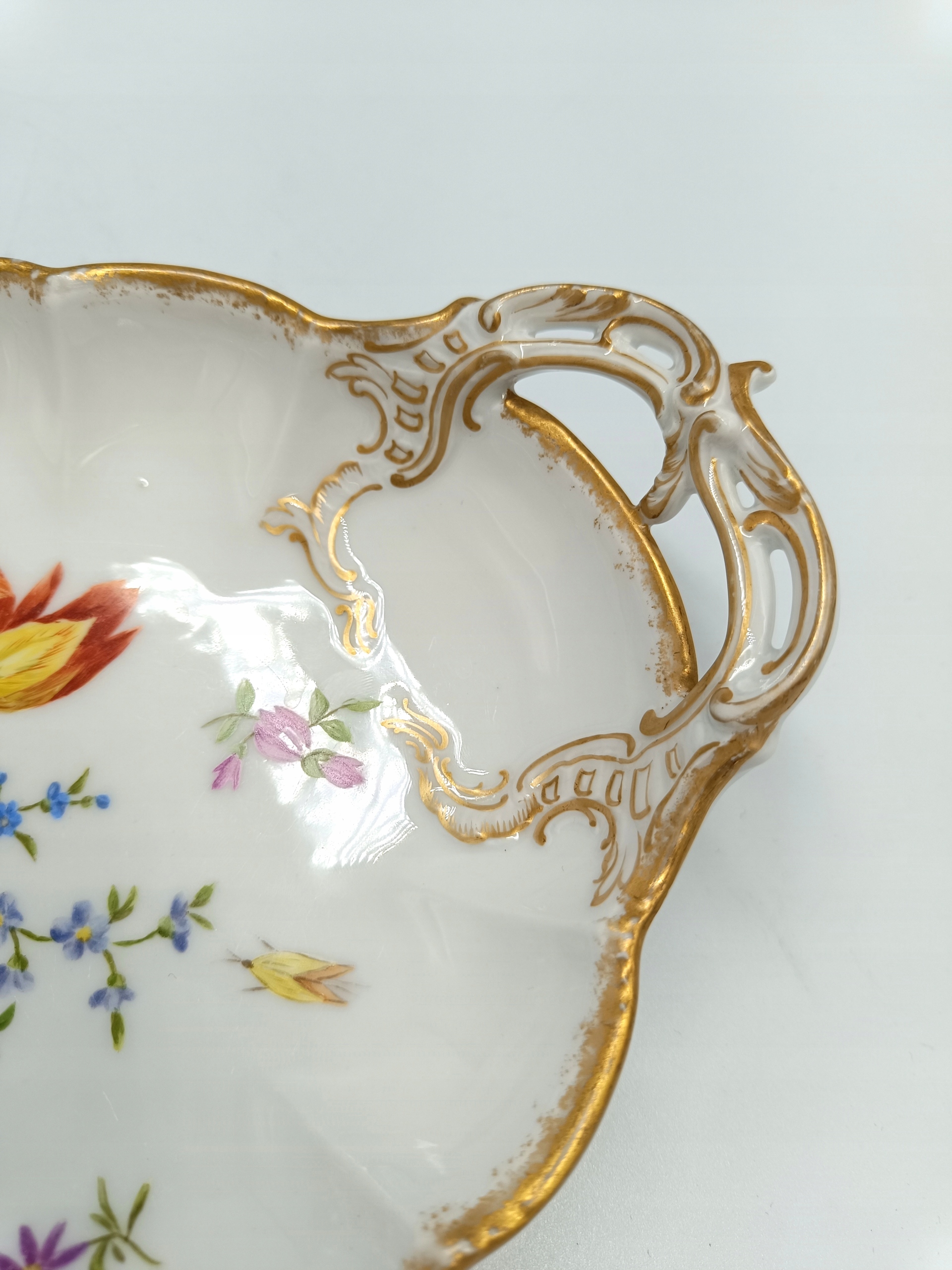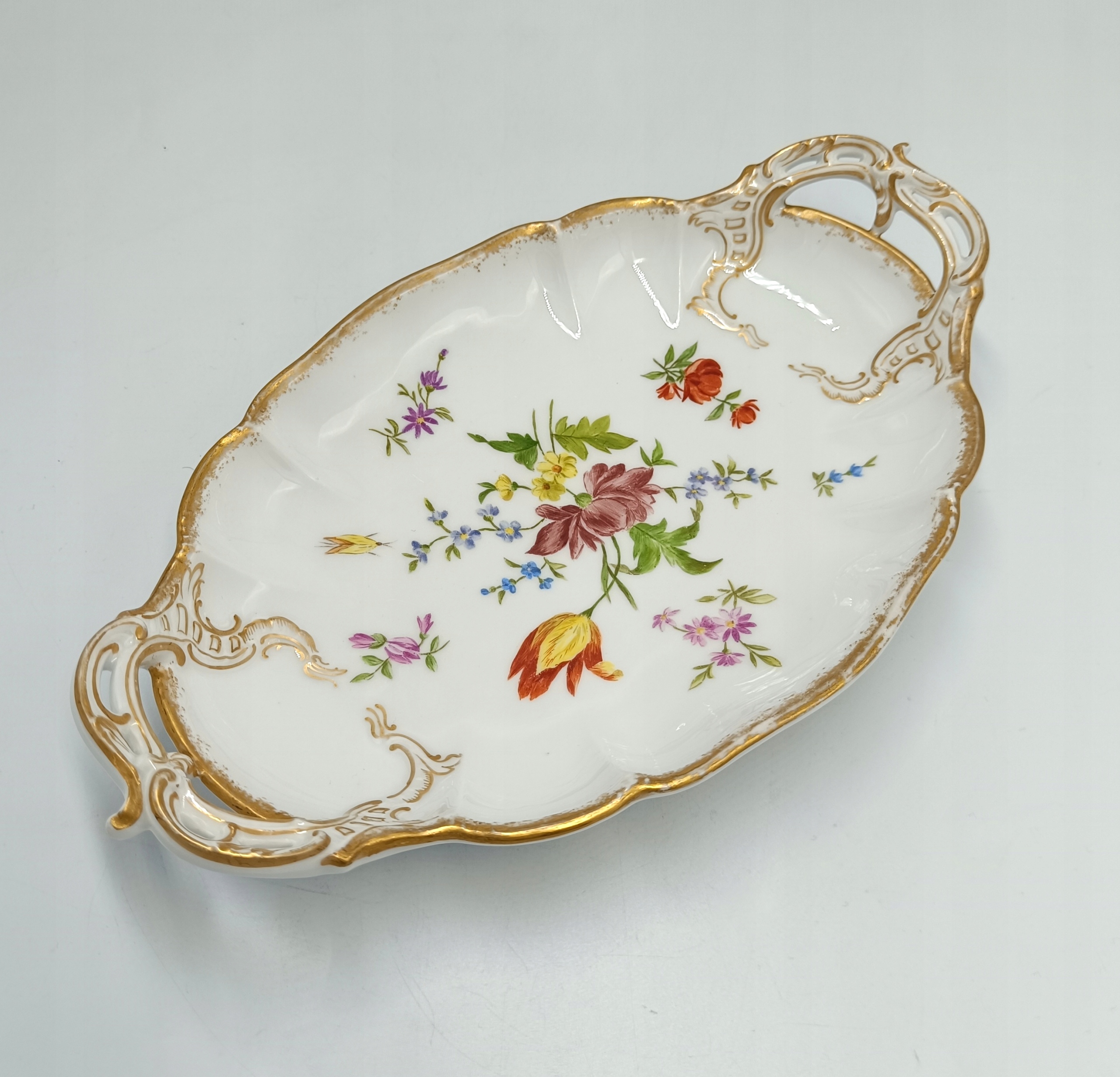 Тарілка виготовлена з білої порцеляни найвищої якості. Красиво профільовані краї та позолочені ручки з обох сторін надають йому унікального характеру, а барвистий квітковий мотив у його центральній частині безумовно доповнює весь виріб. Не можна заперечувати, що тарілка виглядає чудово, а ще краще вона виглядатиме на столі за сімейною вечерею чи в колі друзів. Підпис внизу.