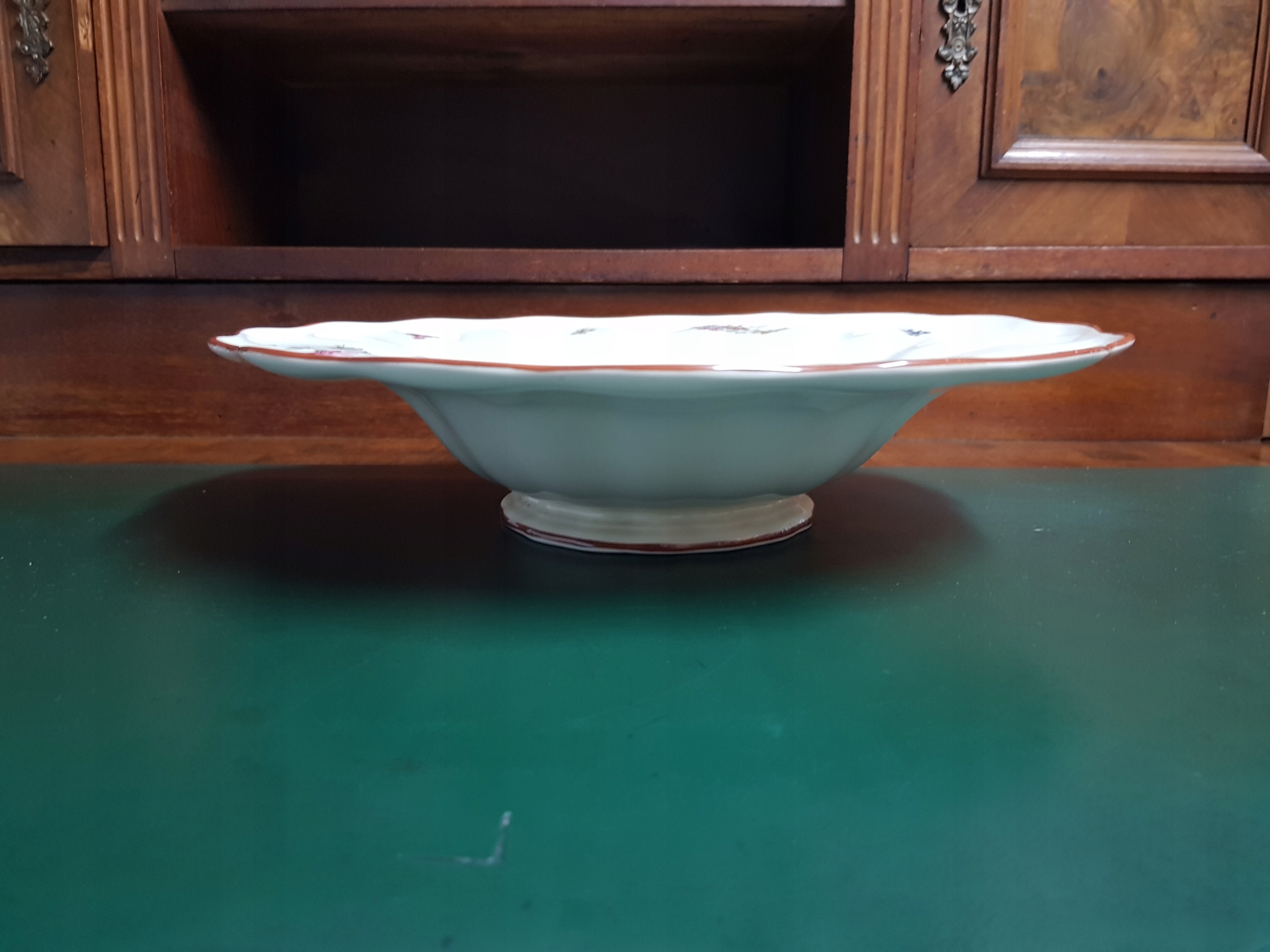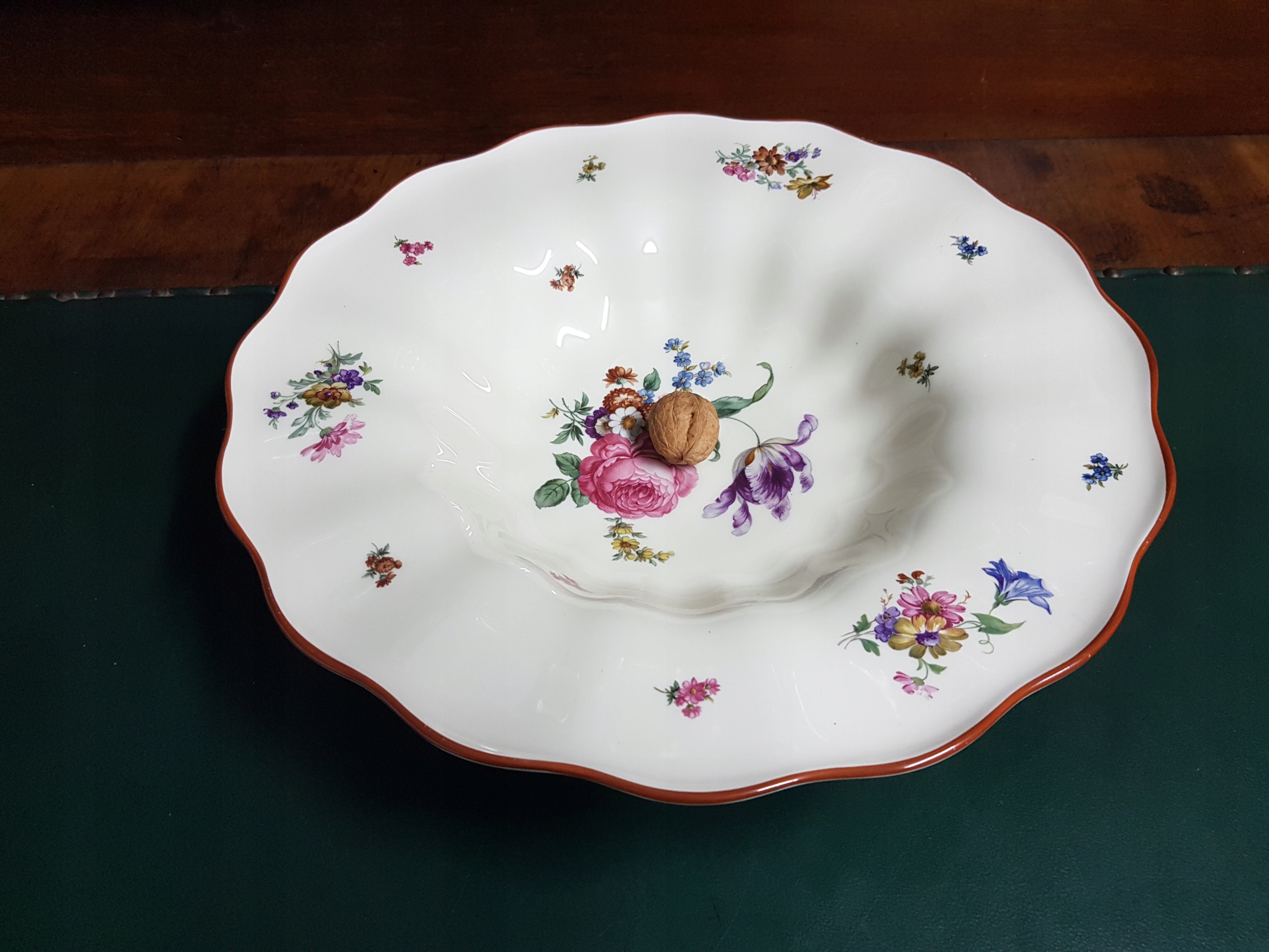 Предметом аукціону є велика хвиляста тарілка від Furstenberg. Квітковий мотив. Кремовий фарфор. Коричневий обідок. Тарілка на ніжці.
