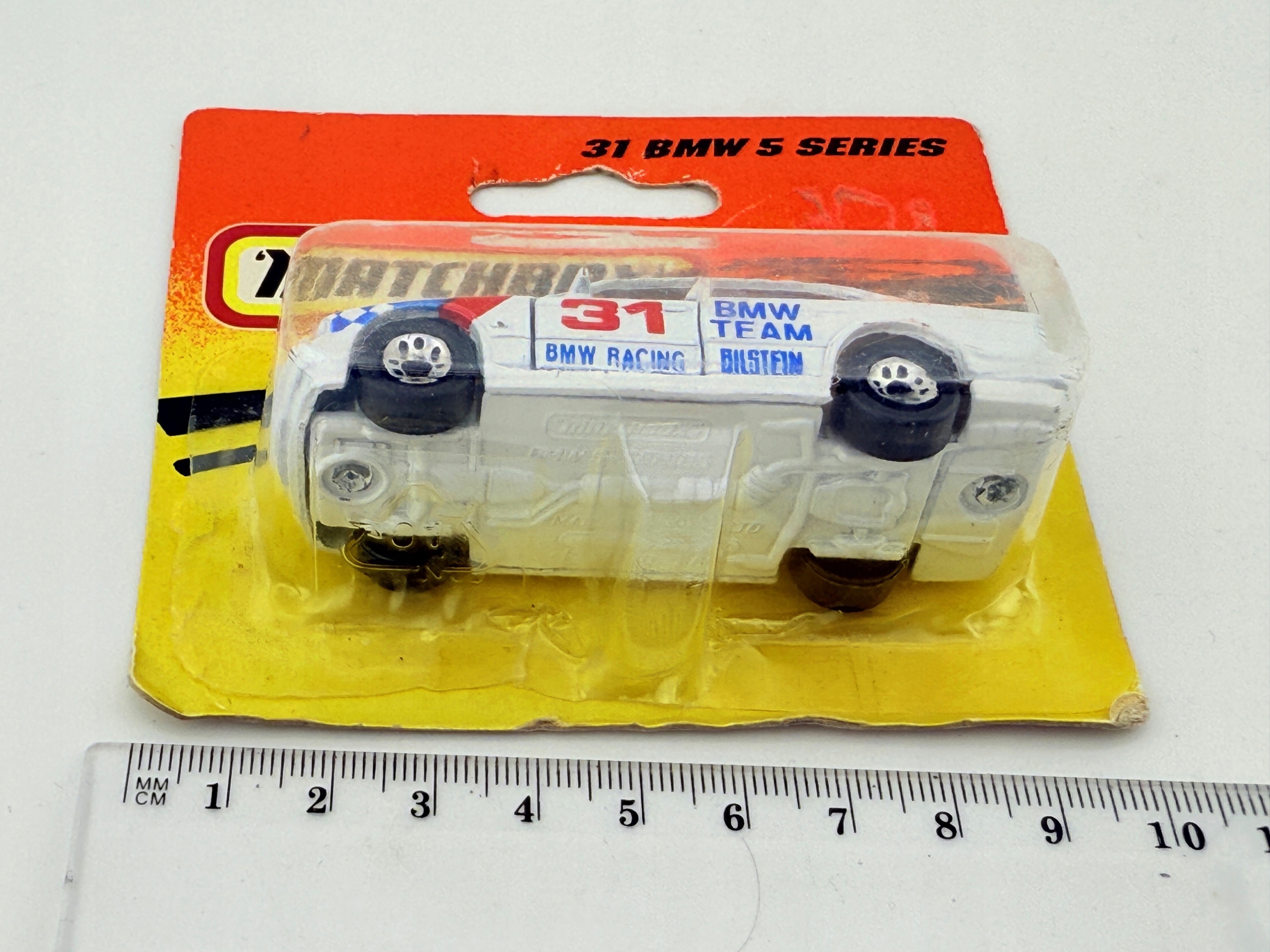 позначка: сірник • Модель: BMW 5 серії • Виробник: Mattel • Масштаб: 1:64 • Умова: Новий • Матеріал: метал + пластик • Довжина (мм): 75 мм • Кольори: Білий з синім та червоним акцентами • Додавання: гоночні шаблони, логотип BMW • Номер каталогу: S5665 • Зроблено в: Таїланді