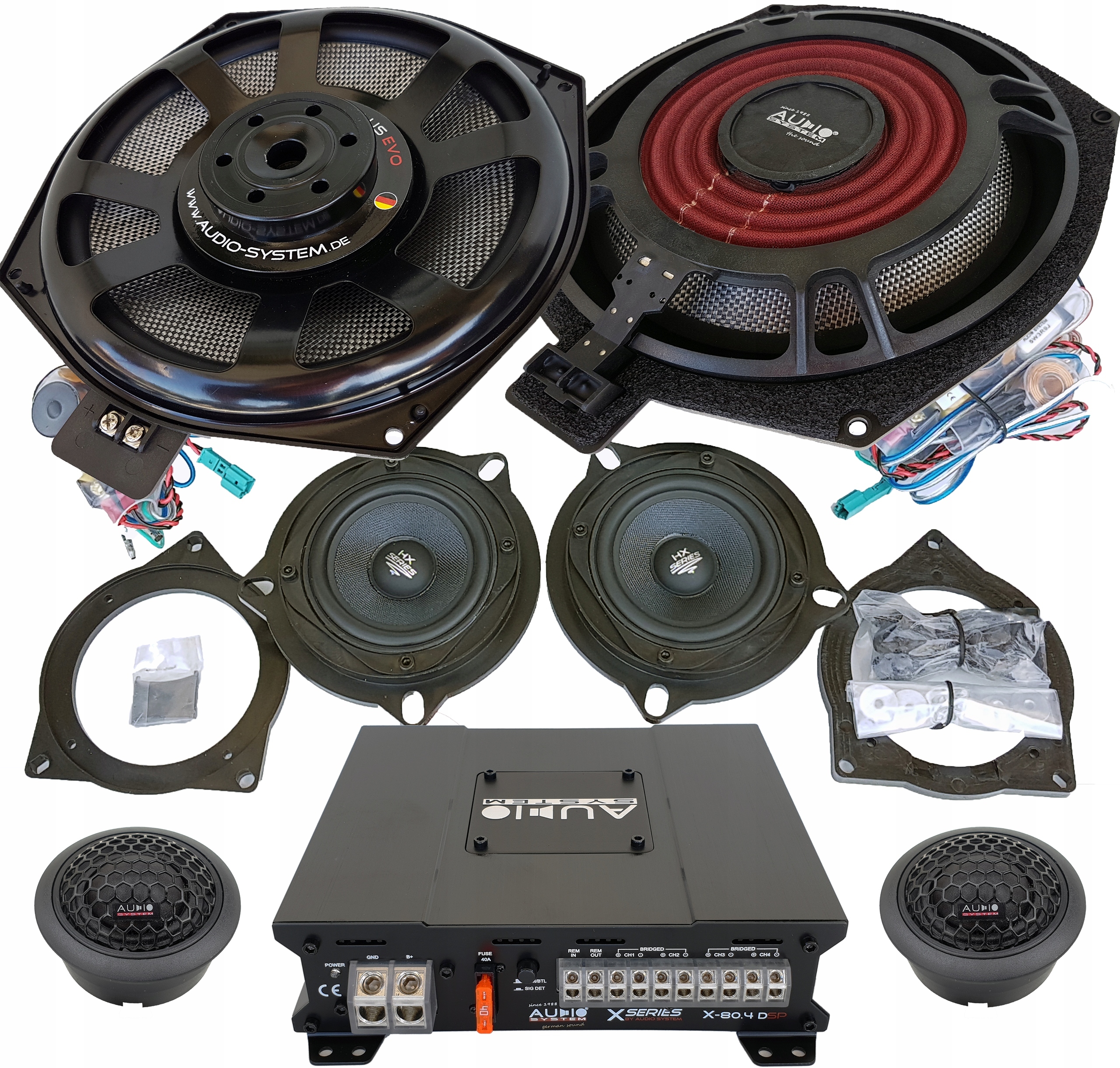 - спеціалізована німецька аудіосистема X200BMW PLUS EVO найвищого класу з найпотужнішими та найпотужнішими сабвуферами на ринку з вуглецевою діафрагмою та вуглецевими середніми частотами та шовковими широкосмуговими твітерами HS25EVO