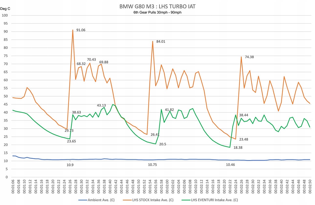 Як і очікувалося, RHS споживання показав подібні дані для запасів і Eventuri, оскільки шлях потоку та матеріали схожі. Проте споживання LHS показує значне покращення IAT з Eventuri.