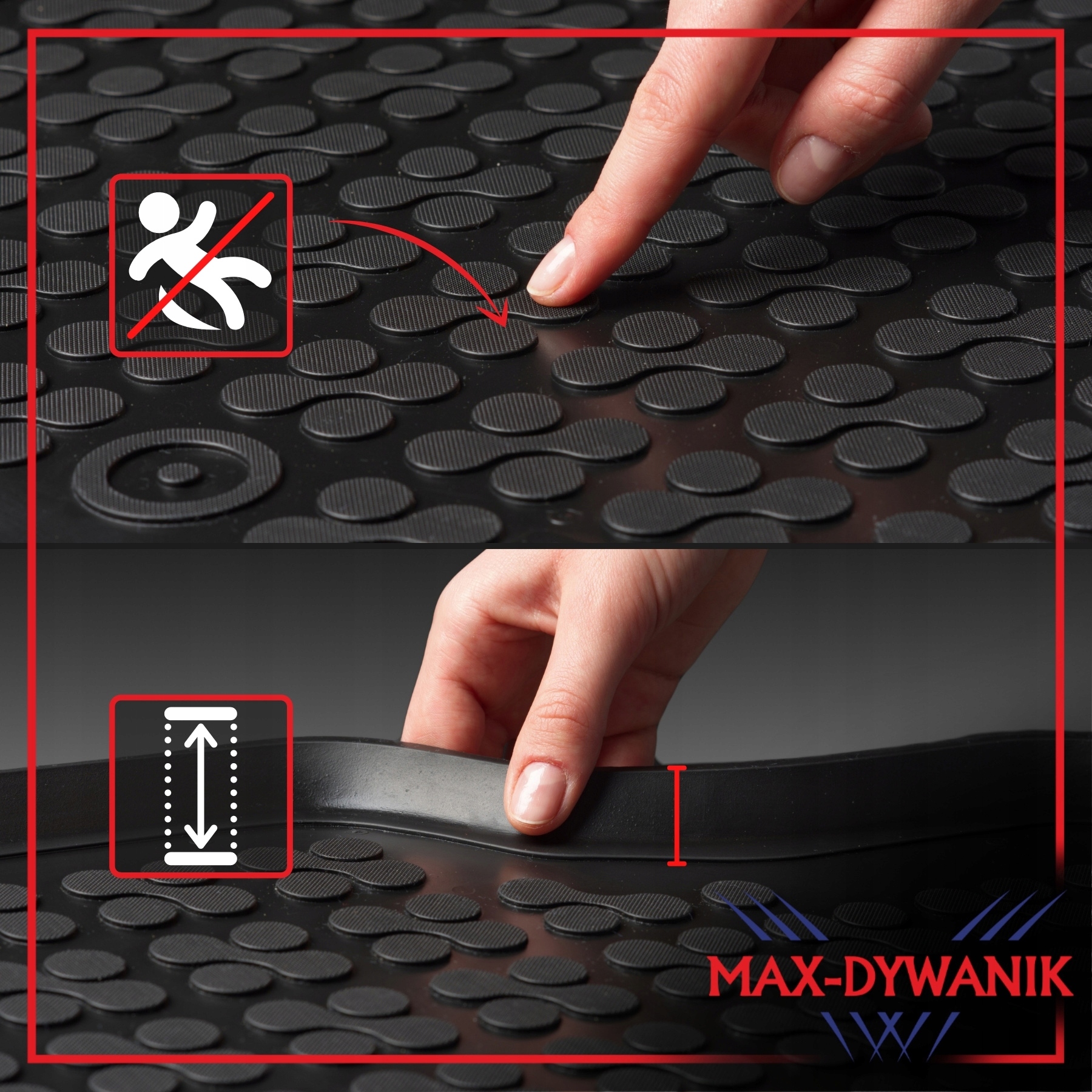 Пропоновані килимки були точно розроблені за формою дошки підлоги, враховуючи не лише марку/модель, але й рік випуску автомобіля, тому килимки ідеально підходять. Килимки виготовлені з високоякісних термоеластомерів (синтетичних каучуків), стійких до фізичних і хімічних факторів (бензин, мастила, розчинники). Високий захисний комір навколо килимків ефективно утримує воду та бруд, захищаючи оригінальну оббивку автомобіля від бруду, а завдяки своїй гнучкості кромка ідеально прилягає до країв, не залишаючи порожніх місць. Характерні колеса з функцією протиковзання та характерний дизайн надають салону автомобіля унікальний вигляд та елегантність. Безпечний у використанні завдяки практичній і зручній системі кріплення до підлоги автомобіля. З метою покращення килимків, вони були модифіковані кріпленнями, виготовленими та встановленими компанією MAX-DYWANIK®.