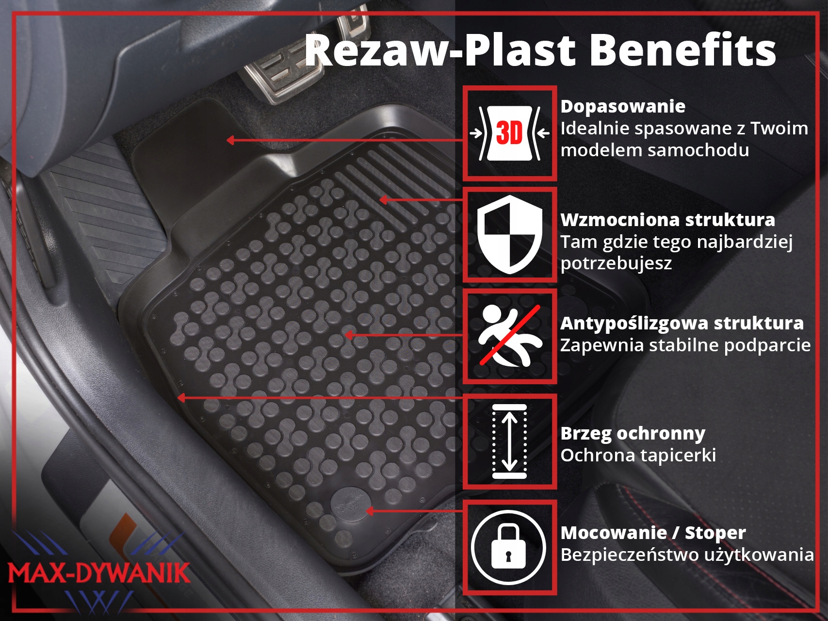 Гумові килимки від відомої польської компанії REZAW-PLAST, модифіковані спеціальними кріпленнями, виготовленими та встановленими компанією MAX-DYWANIK® відповідно до оригінального кріплення в автомобілі.