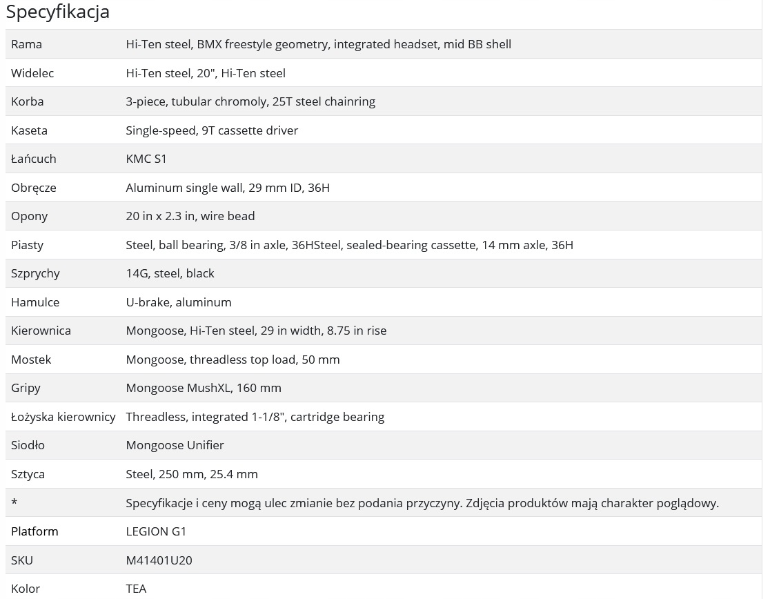 Mongose Legion L60-це велосипед BMX, який був створений як для велосипедних, так і для вуличних ігор та бруду. Конструкція, виготовлена з міцної Hi-Ten Steel-From, що кадр, рульове колесо та вилки-це також краще поглинає Вібрації ін. L60 - це наступна перевага L60 L60 з гарантією дуже низької стійкості до кочення.