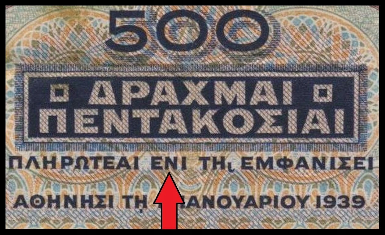 BNA - ГРЕЦІЯ 500 драхм 1939 A-037 172.566 # P109b # ПОМИЛКА ENI РІДКІСНІ # VF