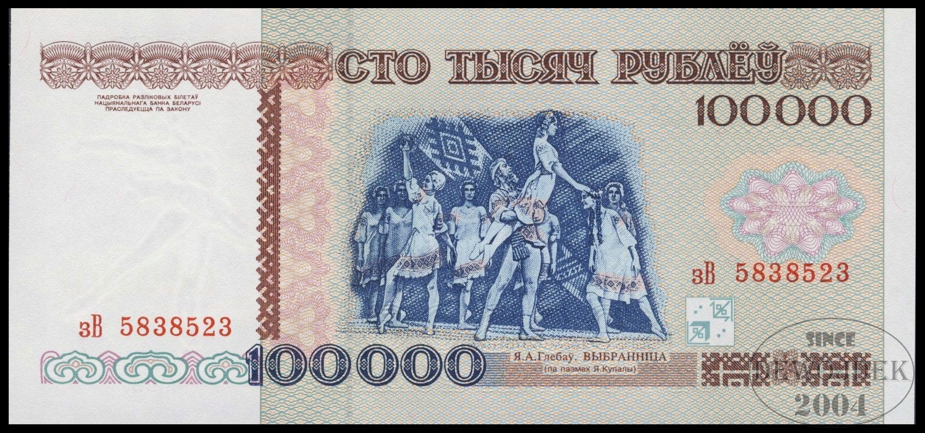 БНБ - БІЛОРУСЬ 100000 Рублів 1996 зB # тип B напис НБРБ # P15a # UNC