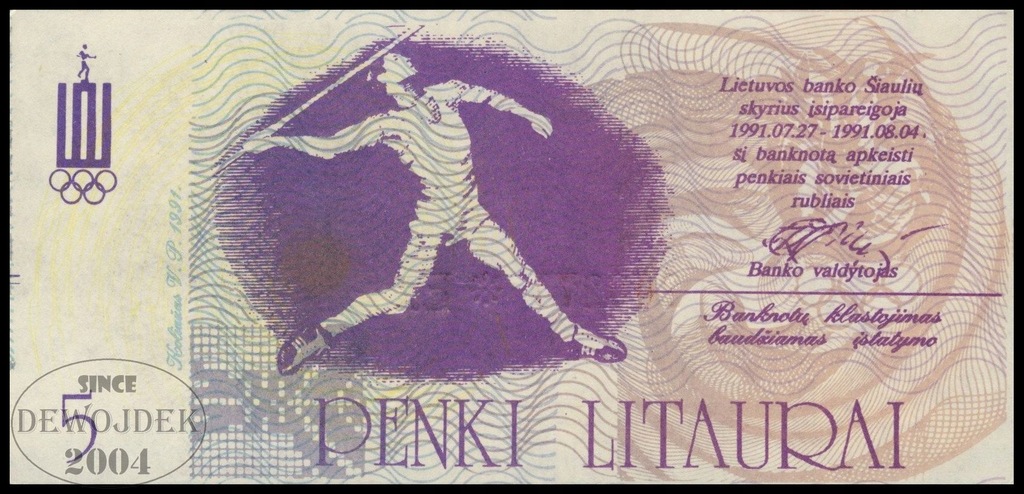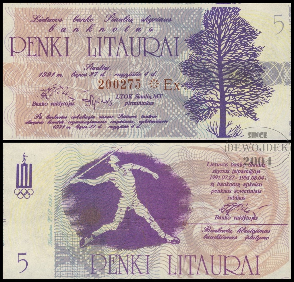 BNB - LITWA SZAWLE Šiauliai 5 Litów Litai 1991 # 200275 Ex # 5 Litaurai UNC
