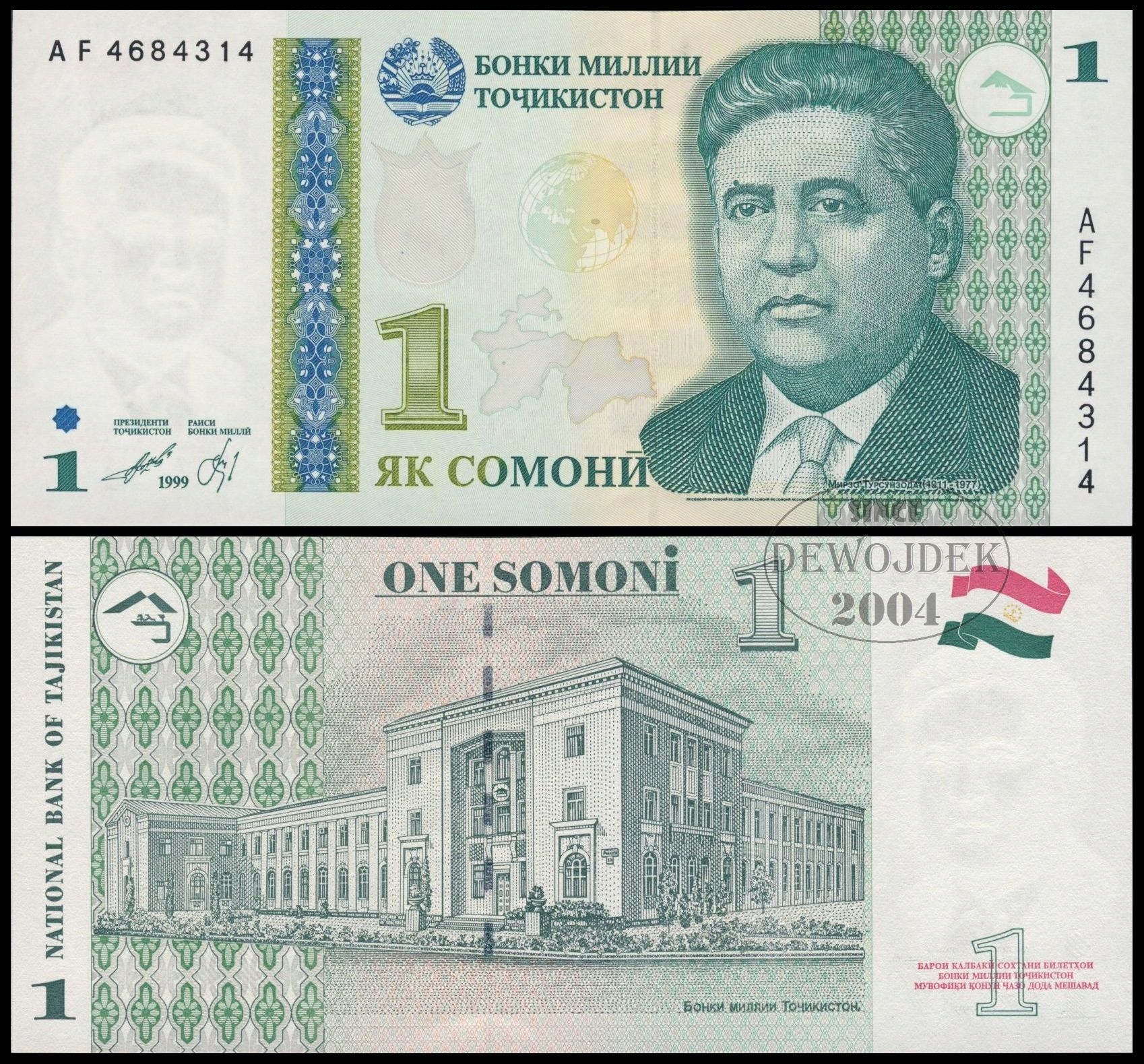 BNB - ТАДЖИКИСТАН 1 сомоні 1999 / 2000 AF 4684314 # P14a # YELLOW GLOB # UNC