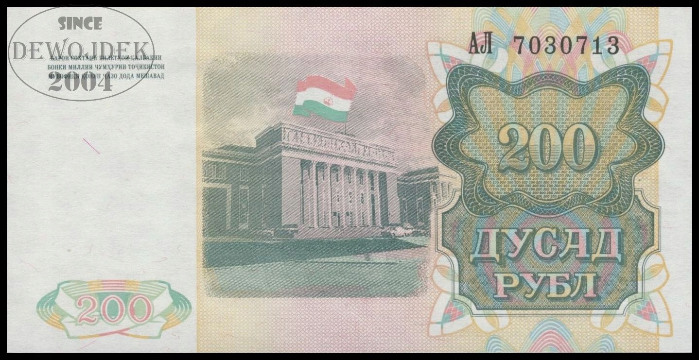 БНБ - ТАДЖИКИСТАН 200 рублів 1994 AЛ 7030713 # P7 # UNC