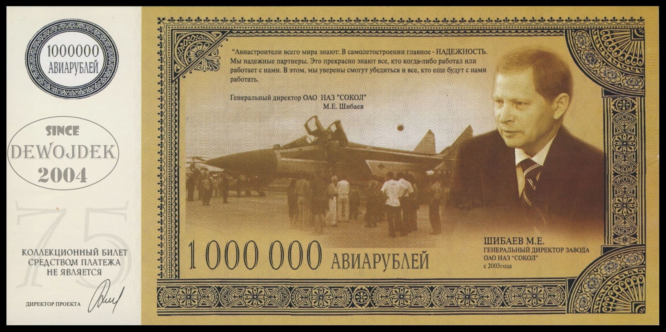 На відзначення До 75-ї річниці заснування легендарного російського авіаційного заводу «Сокул», випущено колекцію авіаційних банкнот, присвячених всесвітньо відомим винищувачам МіГ. На кожній банкноті зображено іншу модель, що представляє в хронологічному порядку історію успіху Мікояна та Гуревича (МіГи). Ці банкноти є колекційним виданням і ніколи не надходили в загальний обіг.